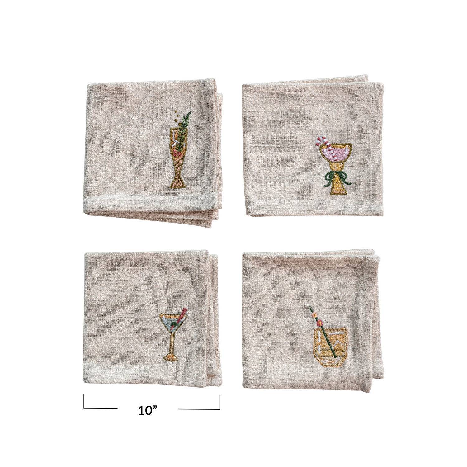 Cotton Cocktail Napkins w/ Embroidered Holiday Cocktail, Set of 4 ©