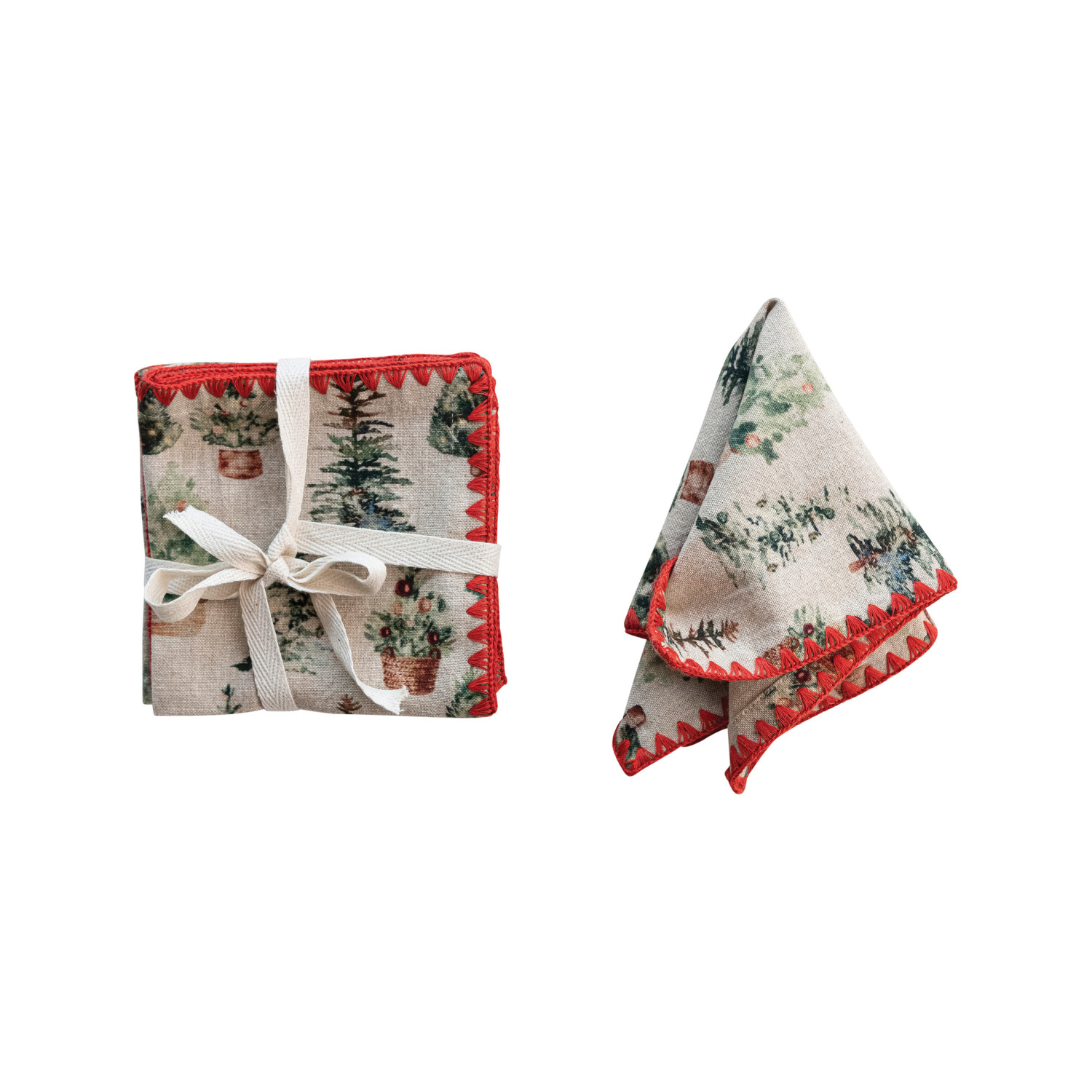 Catalog Name: 10" Square Cotton Printed Cocktail Napkins w/ Trees Pattern & Red Stitched Edge, Multi Color, Set of 4