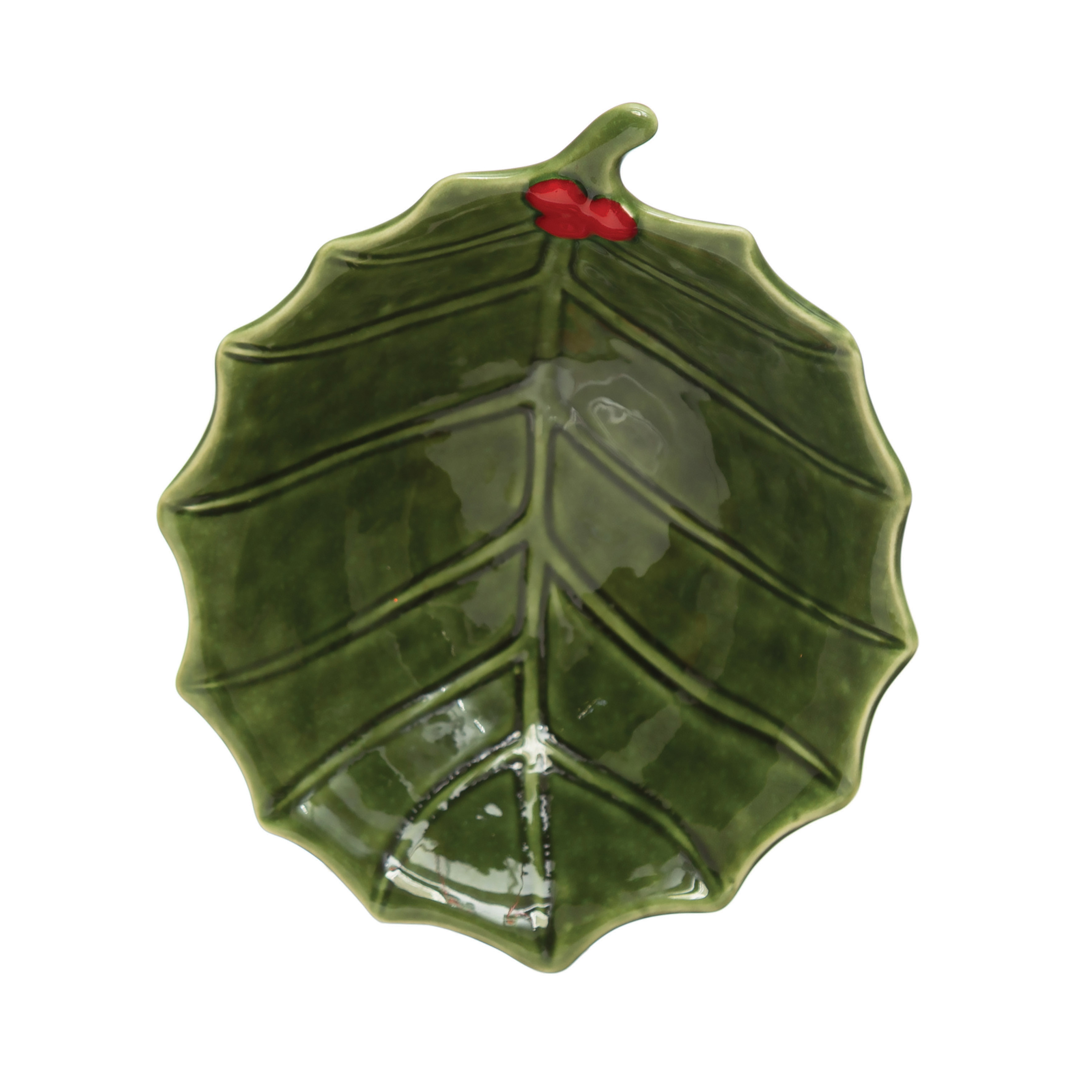 Catalog Name: 5-3/4"L x 4-3/4"W Stoneware Holly Leaf Bowl, Green & Red