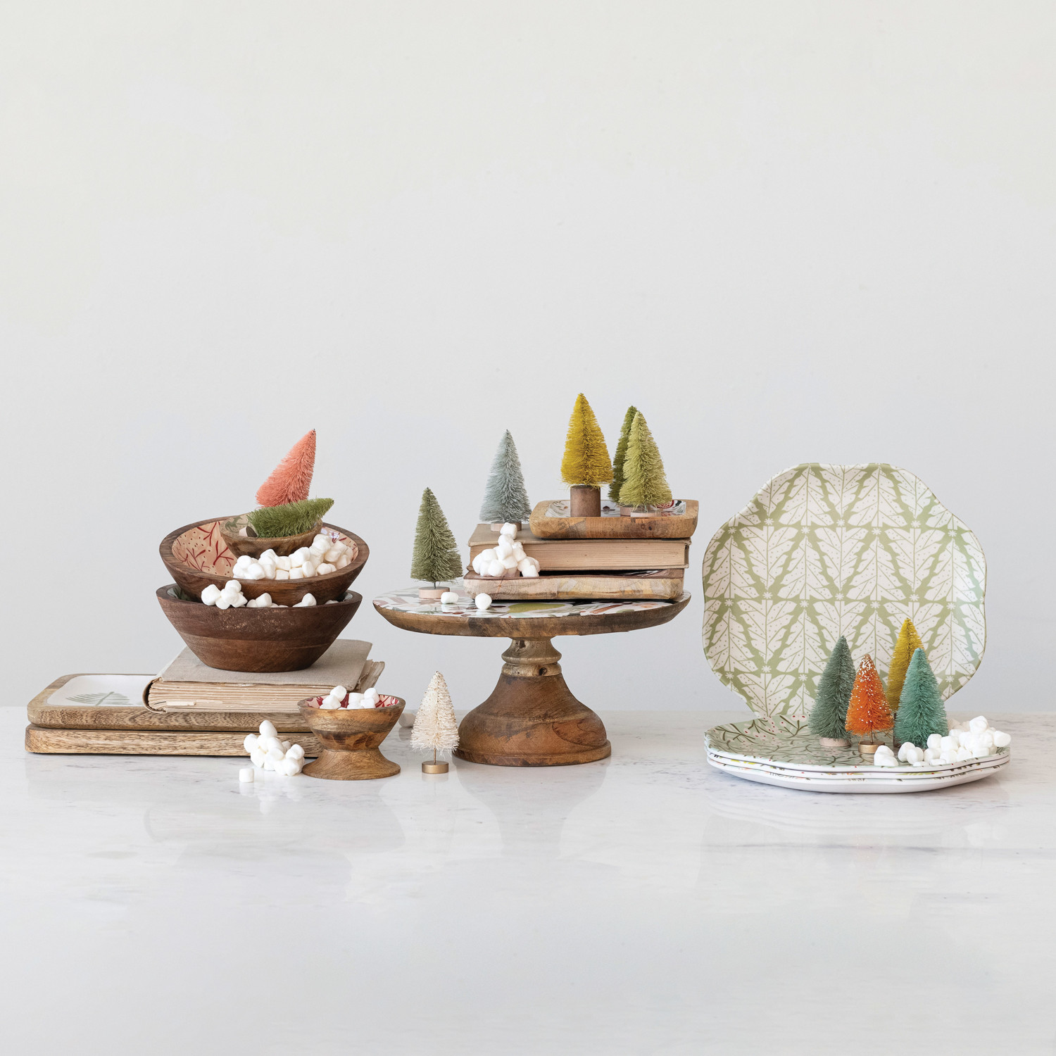 This enameled mango wood pedestal, measuring 11.75 inches in diameter and 5.75 inches high, is a celebration of craftsmanship and design. Adorned with a lush fruit and botanical pattern, its vivid colors bring a burst of life to any table or countertop. The food-safe enamel finish makes it perfect for serving, while the hand-washable care ensures long-lasting beauty. Whether used for special occasions or everyday enjoyment, this pedestal will elevate the dishes to new heights of elegance. Each piece is unique, with slight variations that add to its charm. The pedestal's sturdy construction and timeless style make it a versatile addition to any home decor. Its intricate detailing and vibrant colors make it a stunning centerpiece for any gathering. A vibrant enameled mango wood pedestal graced with a colorful fruit and botanicals pattern, perfect for any lively setting. An eye-catching display piece, this pedestal effortlessly combines functionality with a flair for the dramatic. This pedestal is food safe, ideal for showcasing a decadent cake or an array of hors d'oeuvres at the next gathering.