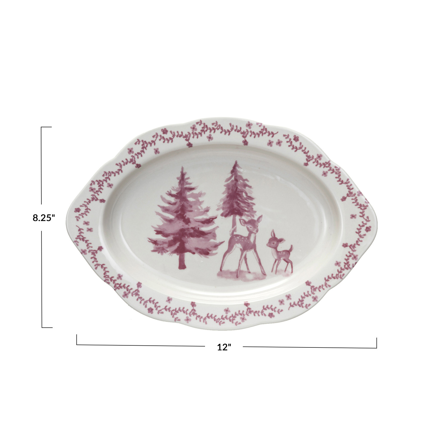 Catalog Name: 12"L x 8-1/4"W Stoneware Platter w/ Deer & Trees, Pink & Cream Color