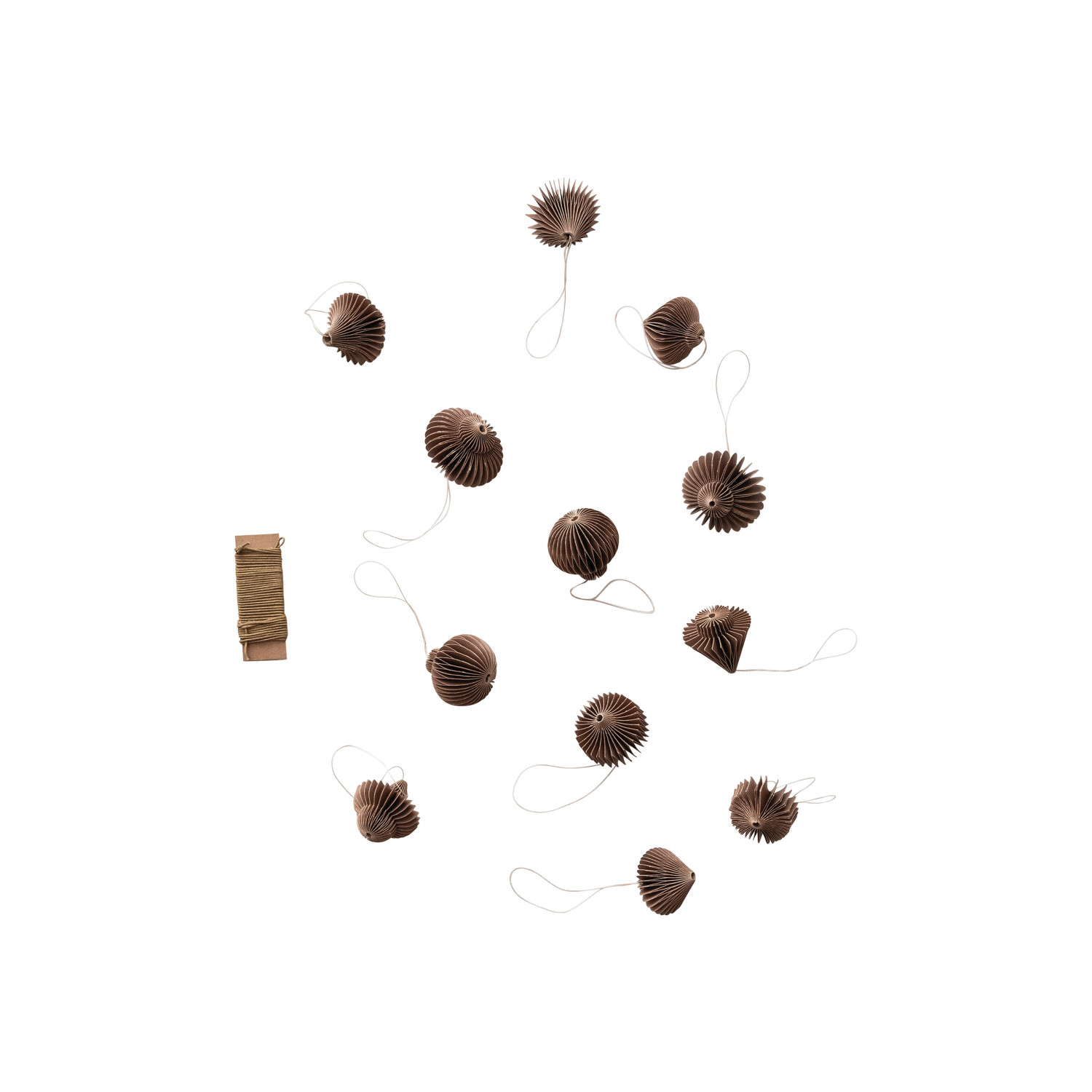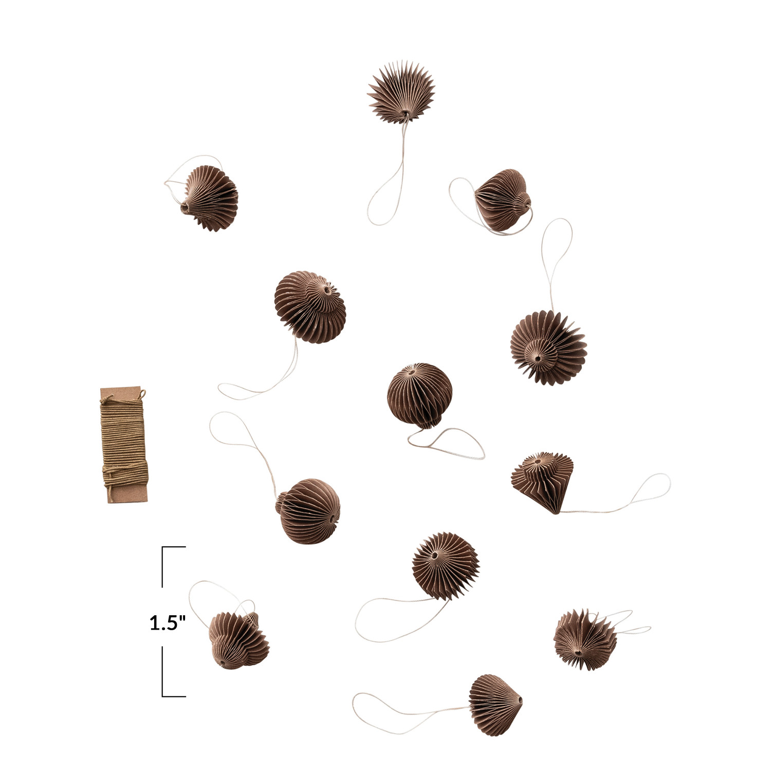 Catalog Name: 1-1/2"H Recycled Paper Folding Honeycomb Ornaments w/ 90"L DIY Garland String, Brown, Boxed Set of 13