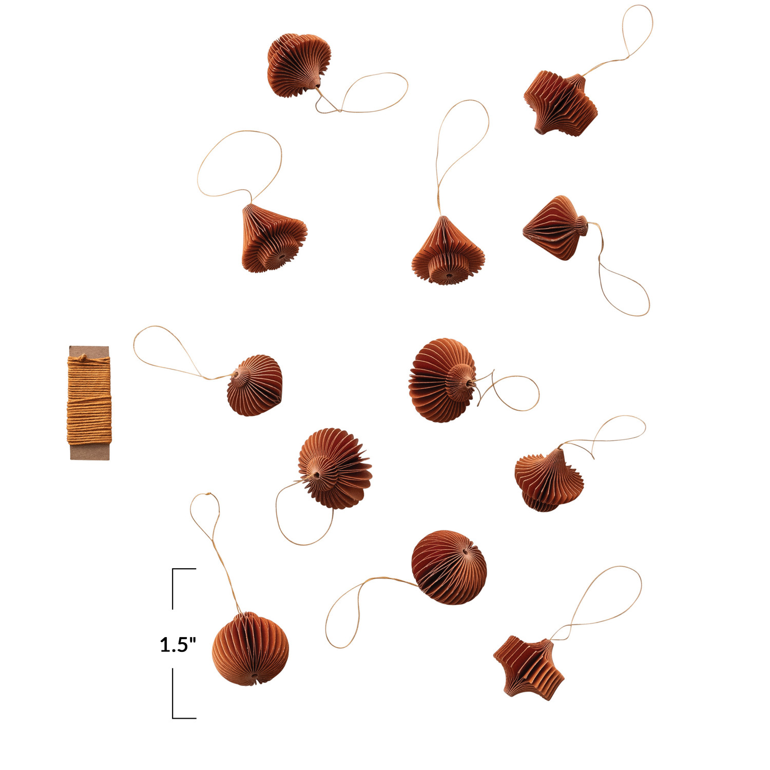 Catalog Name: 1-1/2"H Recycled Paper Folding Honeycomb Ornaments w/ 90"L DIY Garland String, Rust Color, Boxed Set of 13