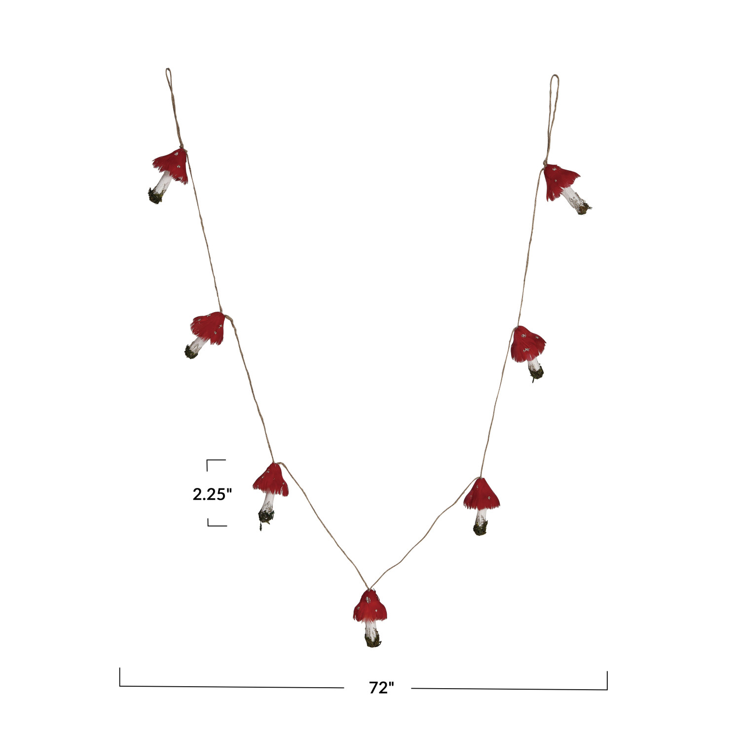 This whimsical 72-inch-long feather and foam mushroom garland adds a touch of playful charm and whimsy to any holiday décor. Adorable mushroom decorations, crafted from soft feathers and foam in a delightful mix of pink, white, and green, create a truly enchanting look. Sparkling gold glitter accents and a touch of faux moss add a touch of magic and whimsy, making this garland a perfect addition to any festive display. Measuring 72 inches long by 2.25 inches high, it's ideal for draping over Christmas trees, mantels, railings, or anywhere a touch of whimsy is desired. The cascading or draped effect adds to the playful charm of this delightful garland. A whimsical and delightful 72-inch long garland featuring adorable mushroom decorations crafted from soft feathers and foam. Sparkling gold glitter accents and a touch of faux moss add a touch of magic and whimsy to any holiday décor. Ideal for draping over Christmas trees, mantels, railings, or anywhere a touch of playful charm is desired.