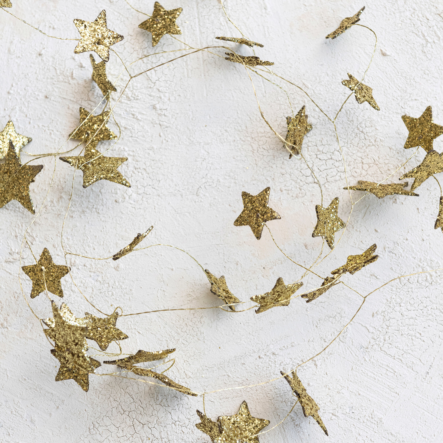 This captivating gold glitter star garland adds a touch of festive cheer and elegance to any holiday décor or special occasion. Sparkling gold glitter stars catch the light beautifully, creating a dazzling display that adds a touch of shimmering magic to every decoration. Made from glittery paper, these stars offer a lightweight design that's easy to drape over Christmas trees, mantels, railings, or anywhere to add a touch of festive cheer. The classic star design complements a variety of decorating styles, while the metallic thread (if applicable) ensures long-lasting durability. Measuring 72 inches in length, this versatile garland is perfect for creating cascading or draped arrangements that will bring a touch of glamour to the holiday season. A captivating 72-inch long garland featuring sparkling gold glitter stars for a touch of glamorous shine. Adds a touch of festive cheer and a touch of elegance to the holiday décor or special occasions. Ideal for draping over Christmas trees, mantels, railings, or anywhere a touch of shimmering magic is desired.
