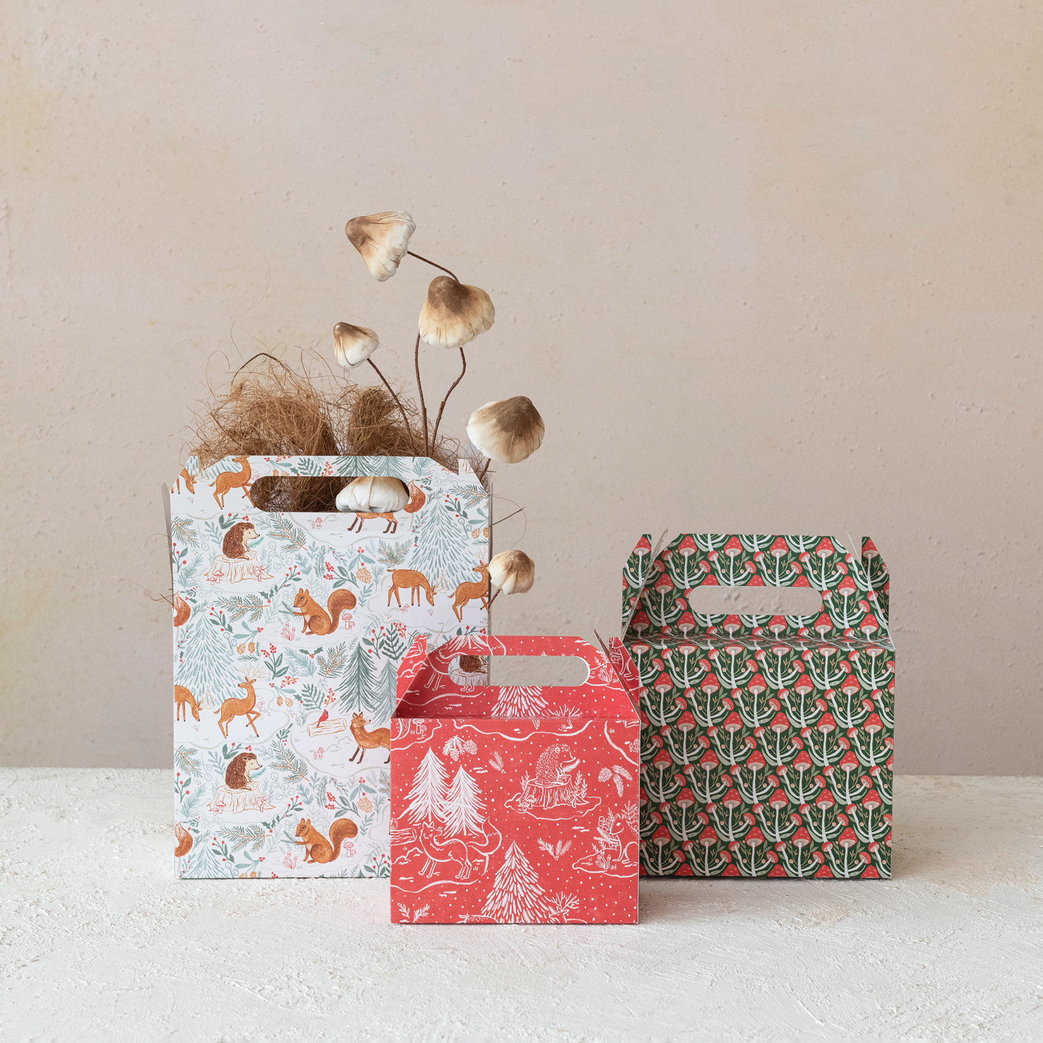 Catalog Name: 8"L x 4"W x 10"H, 7"L x 3-1/2"W x 9"H & 6"L x 3"W x 7"H Printed Recycled Paper Gift Boxes w/ Woodland Flora/Fauna Pattern & Handles, Multi Color, Set of 3 ©