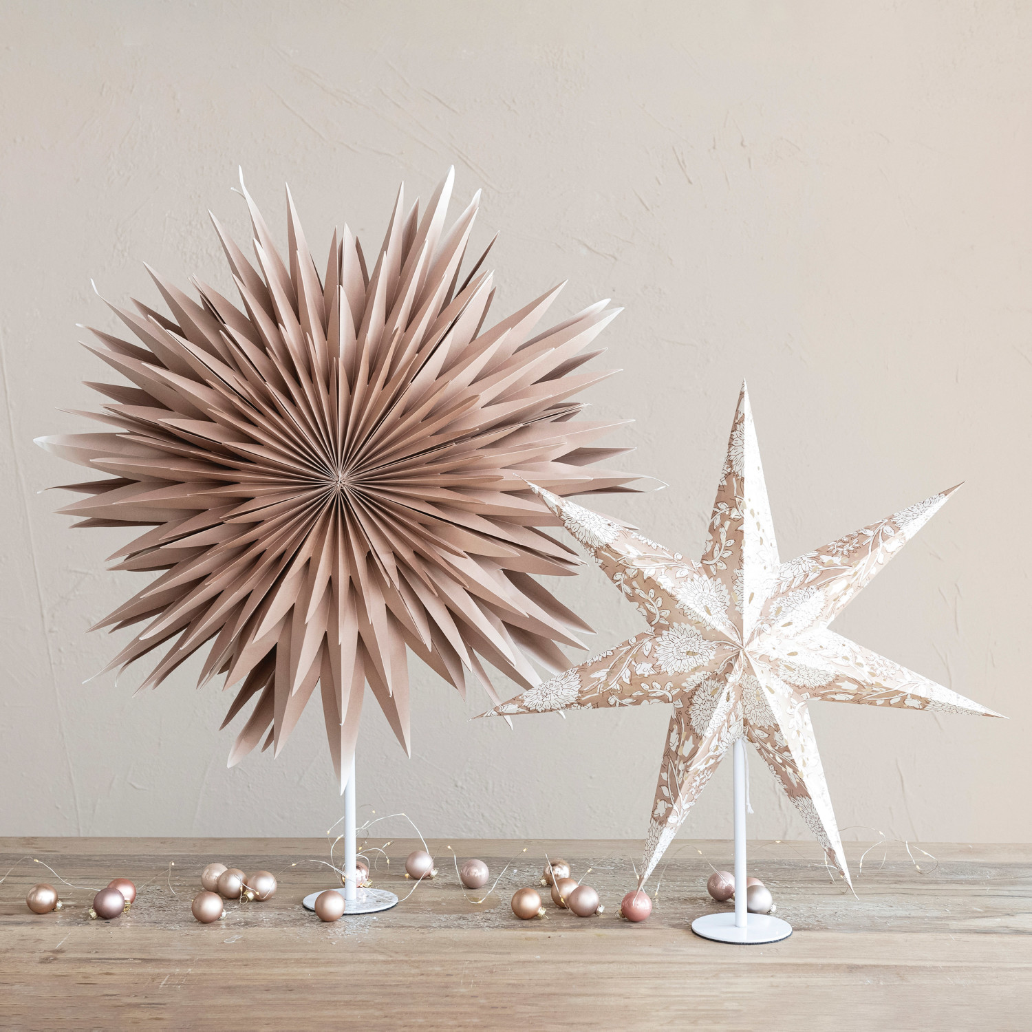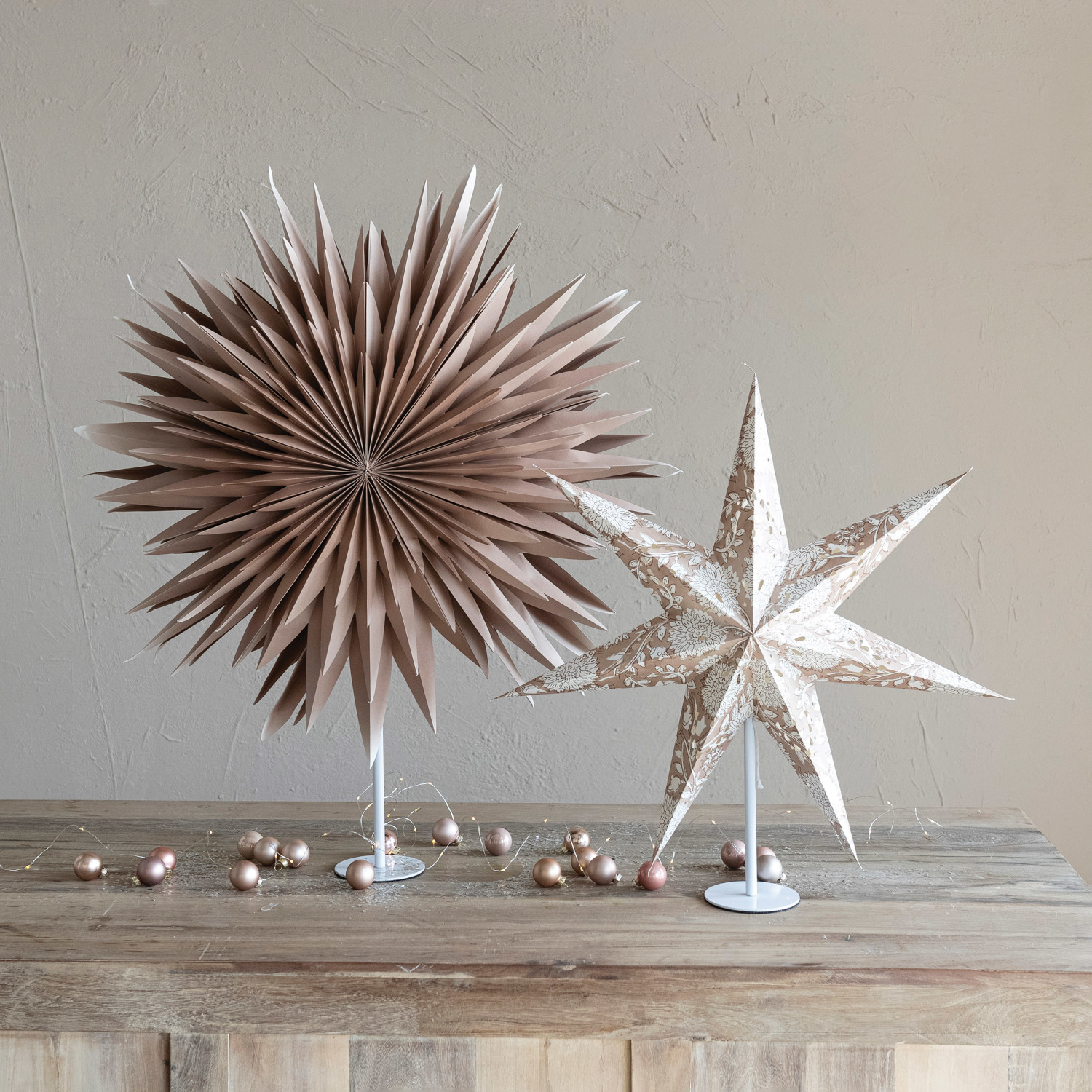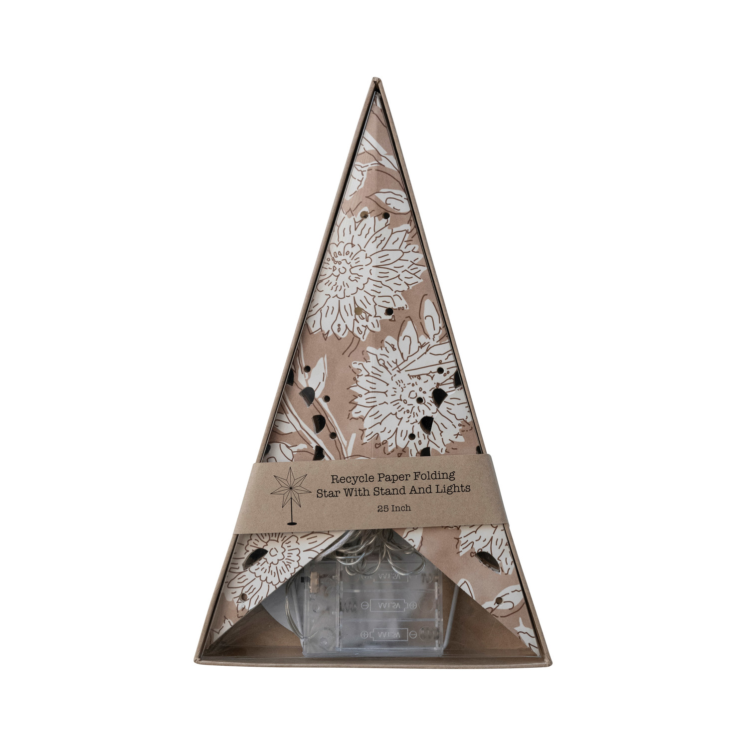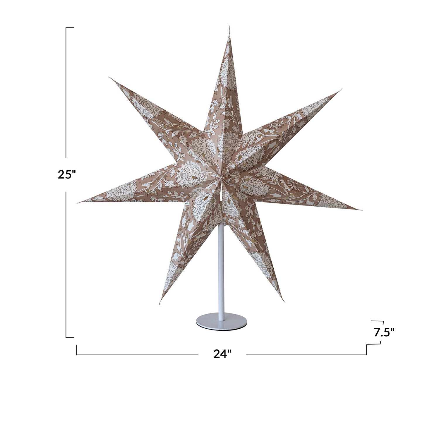 Catalog Name: 24"L x 7-1/2"W x 25"H Printed Recycled Paper Folding Star w/ Pattern, LED Light String & White Metal Stand, Brown & Cream Color (3-AA Batteries Required)