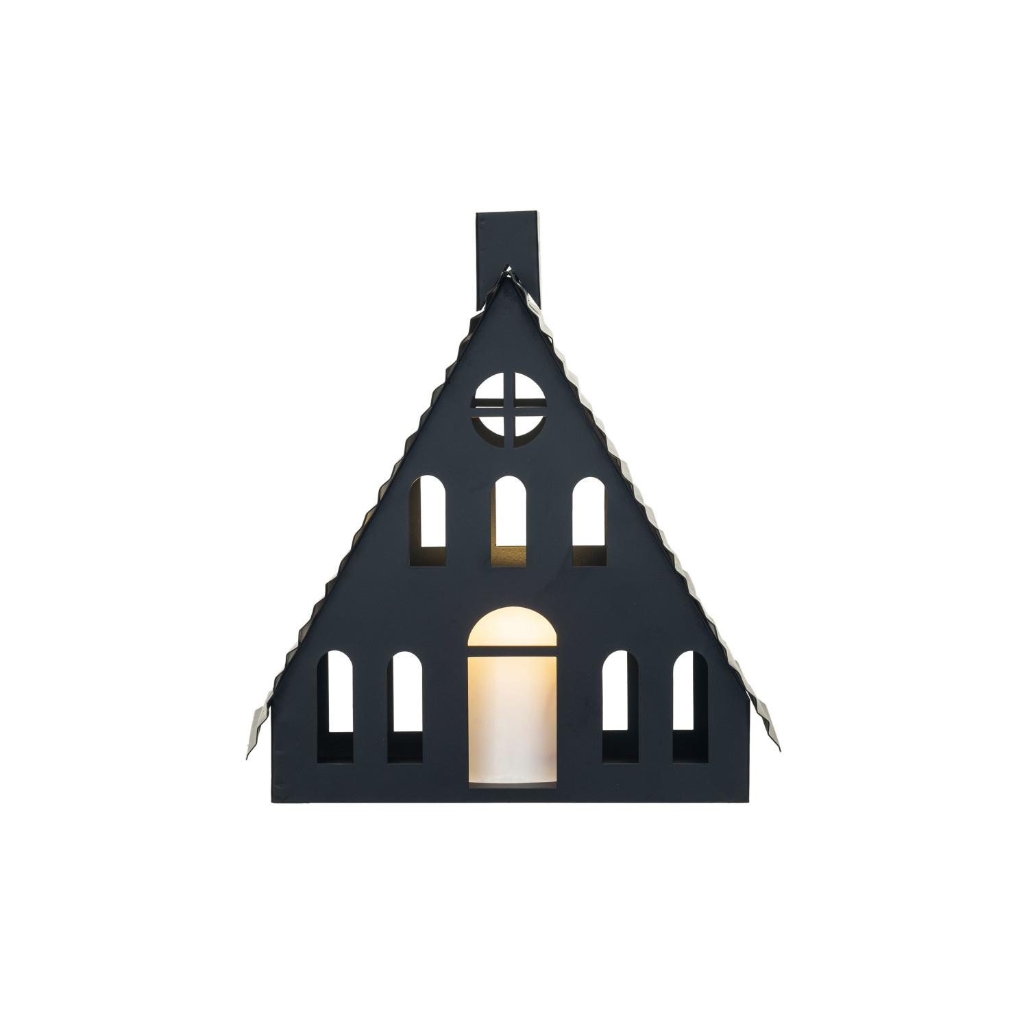 This tall black metal house with LED candle is a cozy and elegant piece that will create a warm and inviting atmosphere. Black gives the item a traditional, classy look and a pleasant feel. A metal design adds texture and complexity to the house, making it a stand out. A LED candle brings warmth and light to the house, making it very cozy. The battery-operated light is easy to turn on and off, making it a practical display. The house is made of metal and LED light, with a sleek and sturdy quality. It is easy to clean and maintain. The house measures 8.5 inches in length, 4 inches in width, and 9 inches in height. This is a versatile and stylish piece that can be displayed on the mantel, shelf, or table. It is a nice piece to add some light and charm to the space. A tall and elegant black metal house with LED candle. A nice piece to add some light and charm to the mantel, shelf, or table. Requires 2-pcs AA batteries.