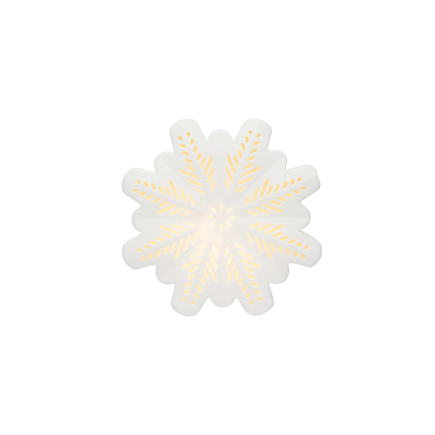 Catalog Name: 7-3/4"L x 7-3/4"H Stoneware Bisque LED Snowflake w/ Cut-Outs, White (Batteries Included)