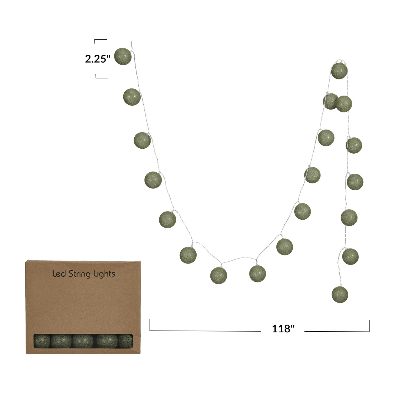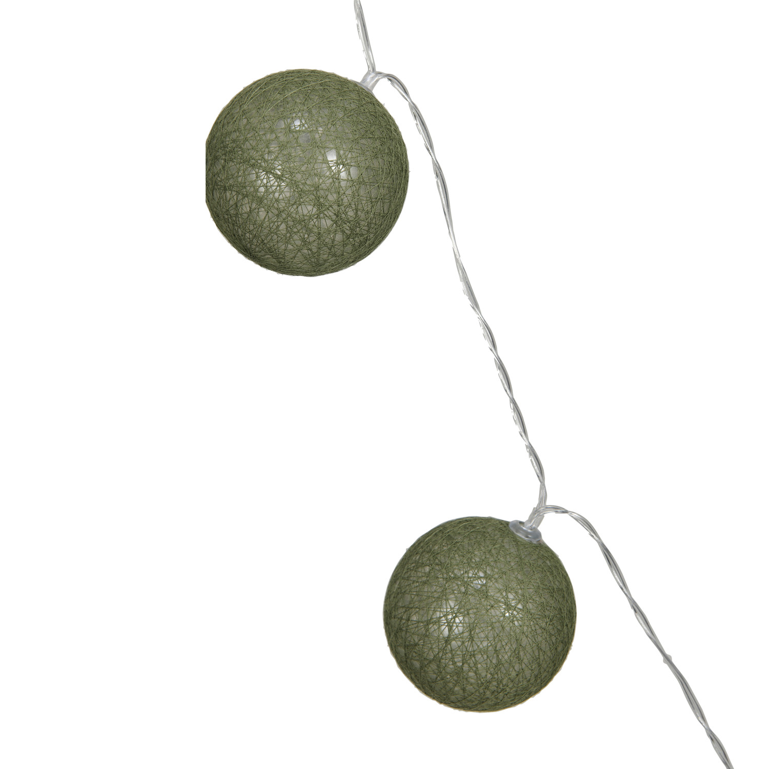 Catalog Name: 118"L x 2-1/4"H Fabric String Ball Lights w/ Plastic Cord & 20 Lights, Green (Requires 2-AA Batteries)