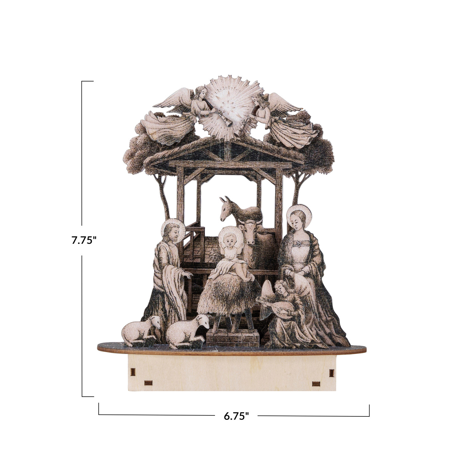 Catalog Name: 6-3/4"L x 3"W x 7-3/4"H Laser Cut Printed Wood Nativity Scene w/ LED Light, Natural & Black (Requires 2-AAA Batteries)