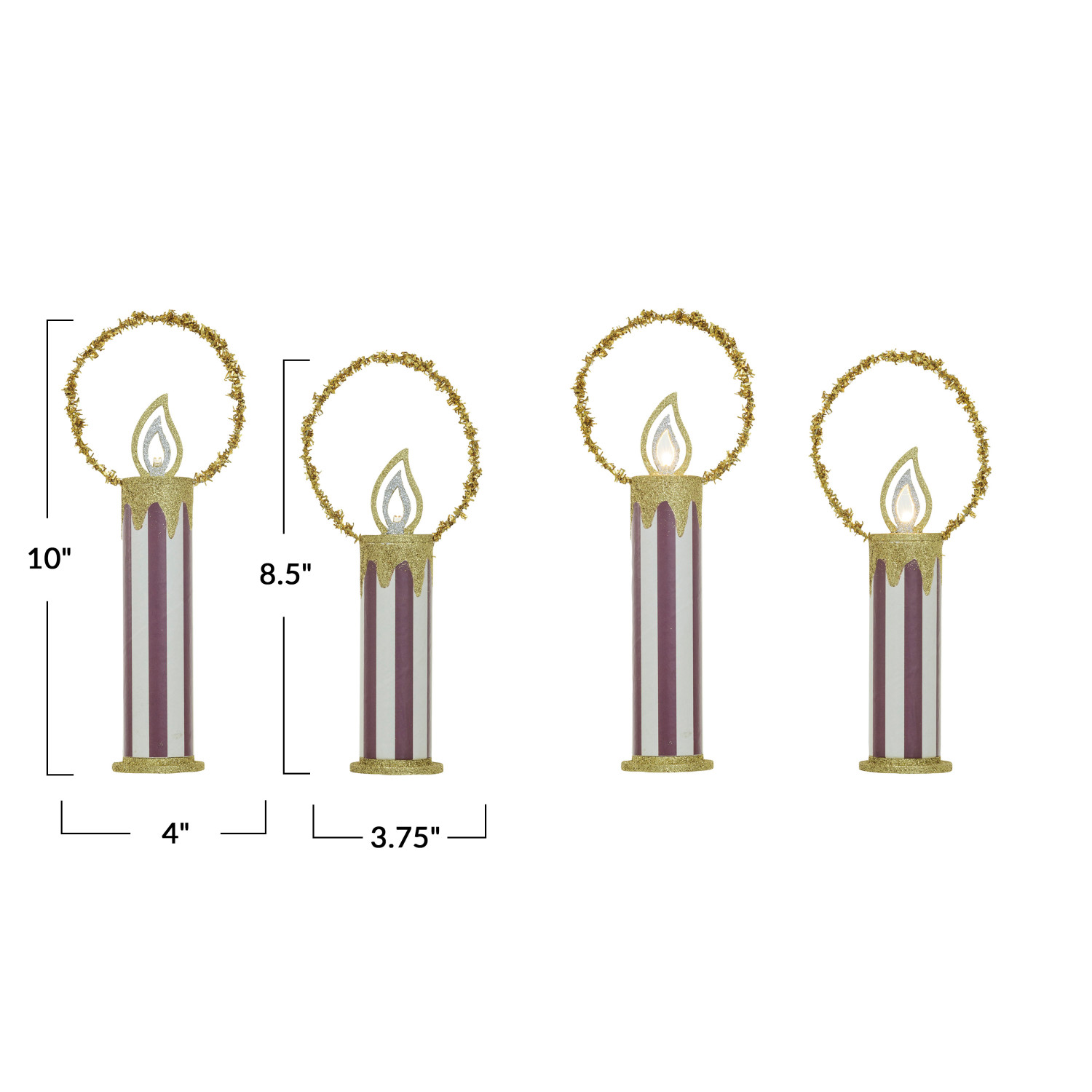 Catalog Name: 4"L x 2"W x 10"H & 3-3/4"L x 2"W x 8-1/2"H MDF Vintage Reproduction Candles w/ LED Light, Glitter & Tinsel, White, Red & Gold Color, Set of 2 (Batteries Included)