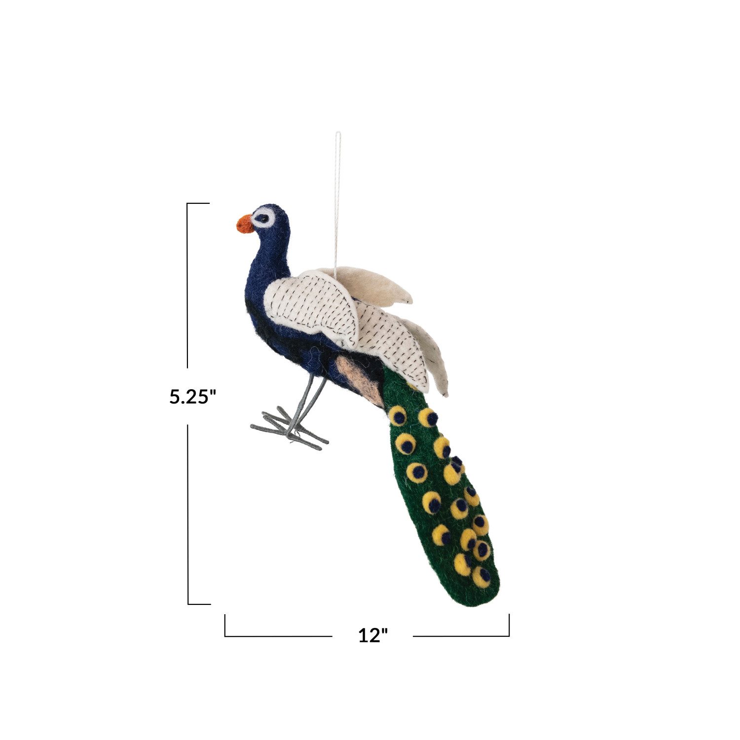 This handmade wool felt peacock ornament is a work of art, measuring 12 inches long and 5.25 inches high. Each ornament is a burst of color, with a body of soft wool felt brought to life by intricate stitching that mimics the majestic bird's natural elegance. The metal elements add a subtle glint, reminiscent of a peacock's iridescent plumage. Whether it's part of the holiday decor or hanging in a place of honor year-round, this ornament is sure to captivate and charm with its vibrant hues and exquisite craftsmanship. It's not just an ornament; it's a celebration of beauty and the skill of the artisan. A stunning peacock ornament with meticulous stitching, showcasing a kaleidoscope of colors in handcrafted wool felt. An exquisite piece that adds a touch of opulence to any festive decor or special occasion. Ideal for gracing Christmas trees, enhancing wreaths, or as a unique gift for bird lovers and collectors.