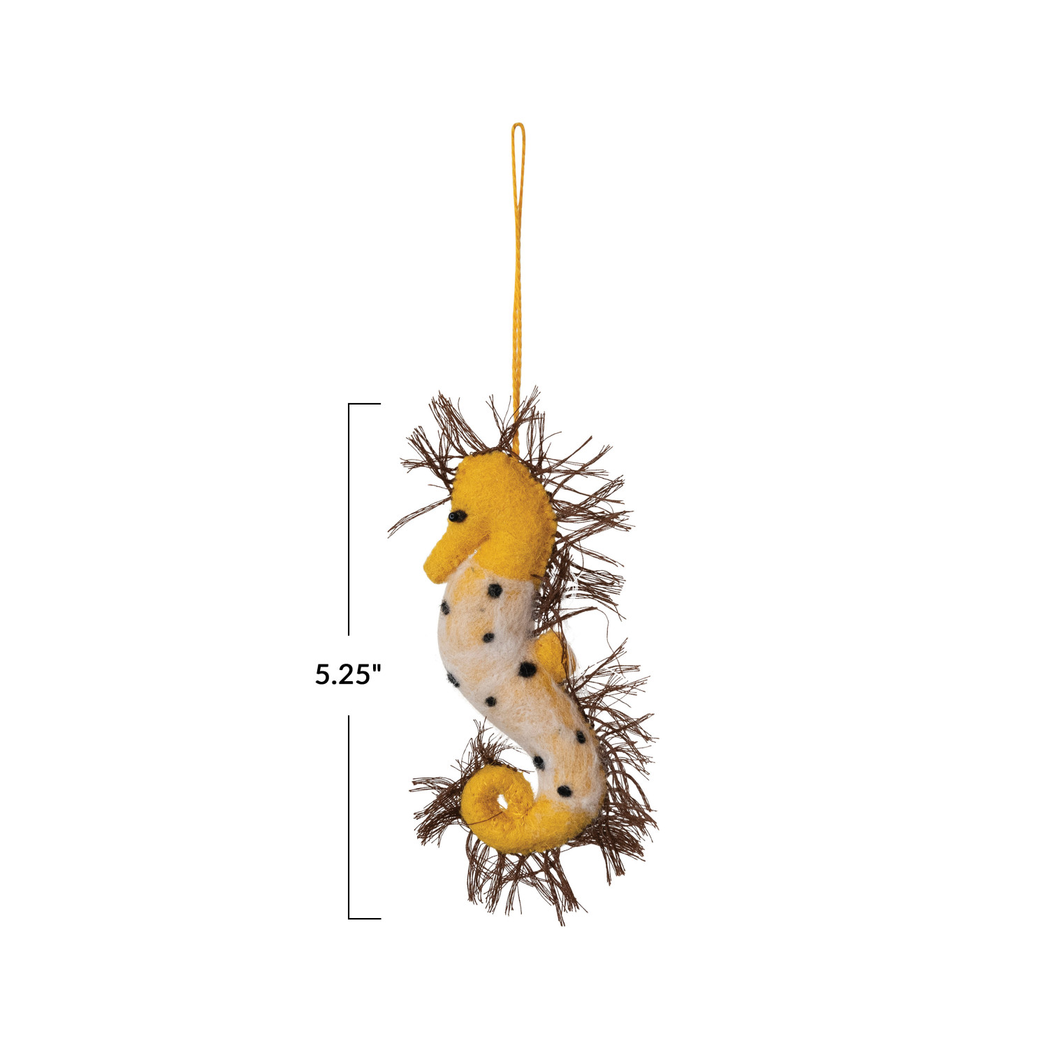 This handmade seahorse ornament is a charming tribute to the wonders of the ocean. Measuring 2.0 inches long, 1.0 inch wide, and 5.25 inches high, it's a delightful size for a variety of display options. The multicolored wool felt, combined with careful stitching, captures the seahorse's delicate features, while the polyester fill gives it a soft, plush feel. Whether it's part of a larger sea-themed holiday display or hanging solo in a coastal-inspired room, this ornament is sure to bring joy and a sense of oceanic adventure to the decor. This is a whimsical piece that celebrates the beauty and diversity of marine life. A colorful seahorse ornament with intricate stitching, crafted from multicolored wool felt to bring a piece of the sea to the home. An ideal adornment that adds a splash of marine elegance to any festive decor or ocean-themed room. Ideal for hanging on the Christmas tree, in a nautical nursery, or alongside other marine decorations for a cohesive underwater theme.