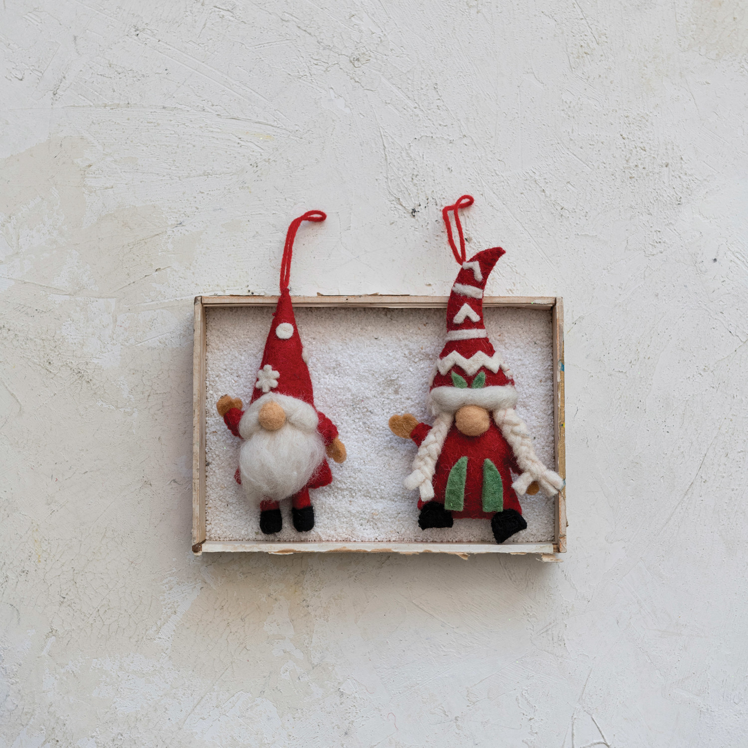 This handmade wool felt gnome ornament set with applique is a whimsical and festive way to add some personality and flair to the home. The set includes two gnome ornaments in multicolor, each with a different applique design. The ornaments feature a soft and durable wool felt fabric, with a long beard, a pointed hat, and a wool string loop for easy hanging. They are embellished with cute details. They are made of natural wool and organic materials, making them eco-friendly and safe for the family. Decorate the wall, shelf, or Christmas tree, or use them as a gift or a toy as these ornaments will bring a touch of magic and joy to any space. They also make a great gift for friends and family who love gnomes or handmade crafts. A whimsical and festive set of gnome ornaments with multicolor wool felt, applique, and wool string loops. A perfect accessory for any Scandinavian, Nordic, or fairy tale style decor. Ideal for hanging on the wall, shelf, or Christmas tree, or using as a gift or a toy.