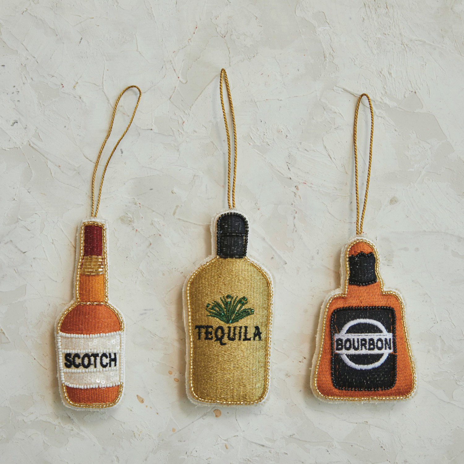 This cotton blend "Tequila" bottle ornament is a whimsical nod to festive celebrations. Adorned with glass beads and embroidery, it features a rich palette of gold, black, and green, capturing the essence of a fine spirit. Measuring 2.25 inches long and 4.75 inches high, it's the perfect size to make a statement on the tree or as part of a decorative display. Whether it's bringing a smile to the holiday decor or serving as a quirky gift for a friend, this ornament is sure to be a conversation starter. A spirited addition to any celebration, this ornament mimics a tequila bottle, complete with intricate glass beadwork and embroidery in gold, black, and green. An ideal gift for the connoisseur, it's perfect for adding a touch of cheer to holiday gatherings or as a novelty for a home bar. Ideal for festive occasions or as a unique kitchen accent, this ornament brings a fun twist to traditional decor.
