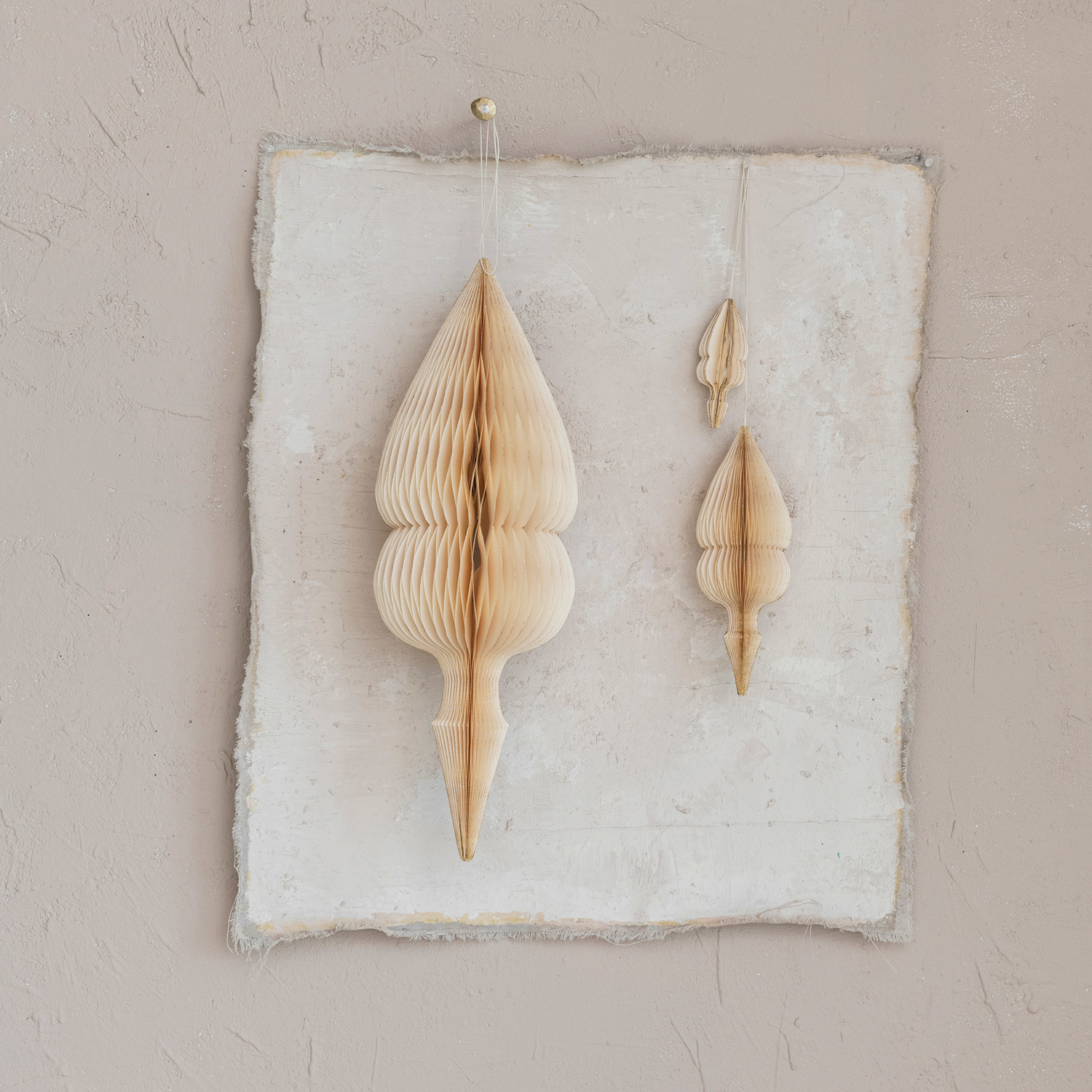 This collection of cream-colored honeycomb finial ornaments is a sophisticated addition to any holiday decoration. Each finial features a complex honeycomb pattern, adding a unique textural element. These sophisticated paper ornaments, made of delicately folded paper and attached with a string, make a grand visual impact. They blend seamlessly with any color scheme and are a statement piece. The neutral cream hue ensures they will blend seamlessly with any color scheme, and their impressive size makes them a statement piece. Crafted from paper with a string for easy hanging, these ornaments are a testament to the beauty of simplicity and tradition. A set of 3 elegant finial-shaped paper ornaments with a delicate honeycomb design in cream. An exquisite addition that brings a sophisticated and soft texture to any festive decor. Ideal for creating a focal point on the Christmas tree or as a part of a stylish holiday vignette.