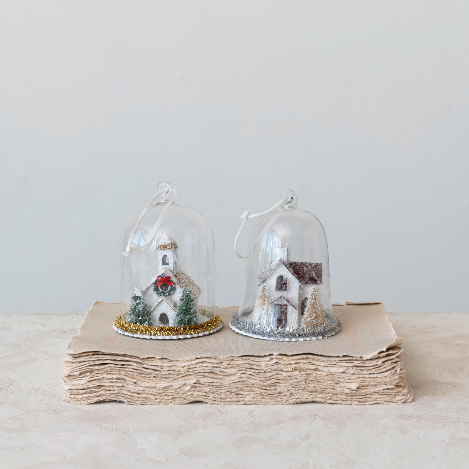 Glass Cloche Ornament w/ House & LED Light, 2 Styles