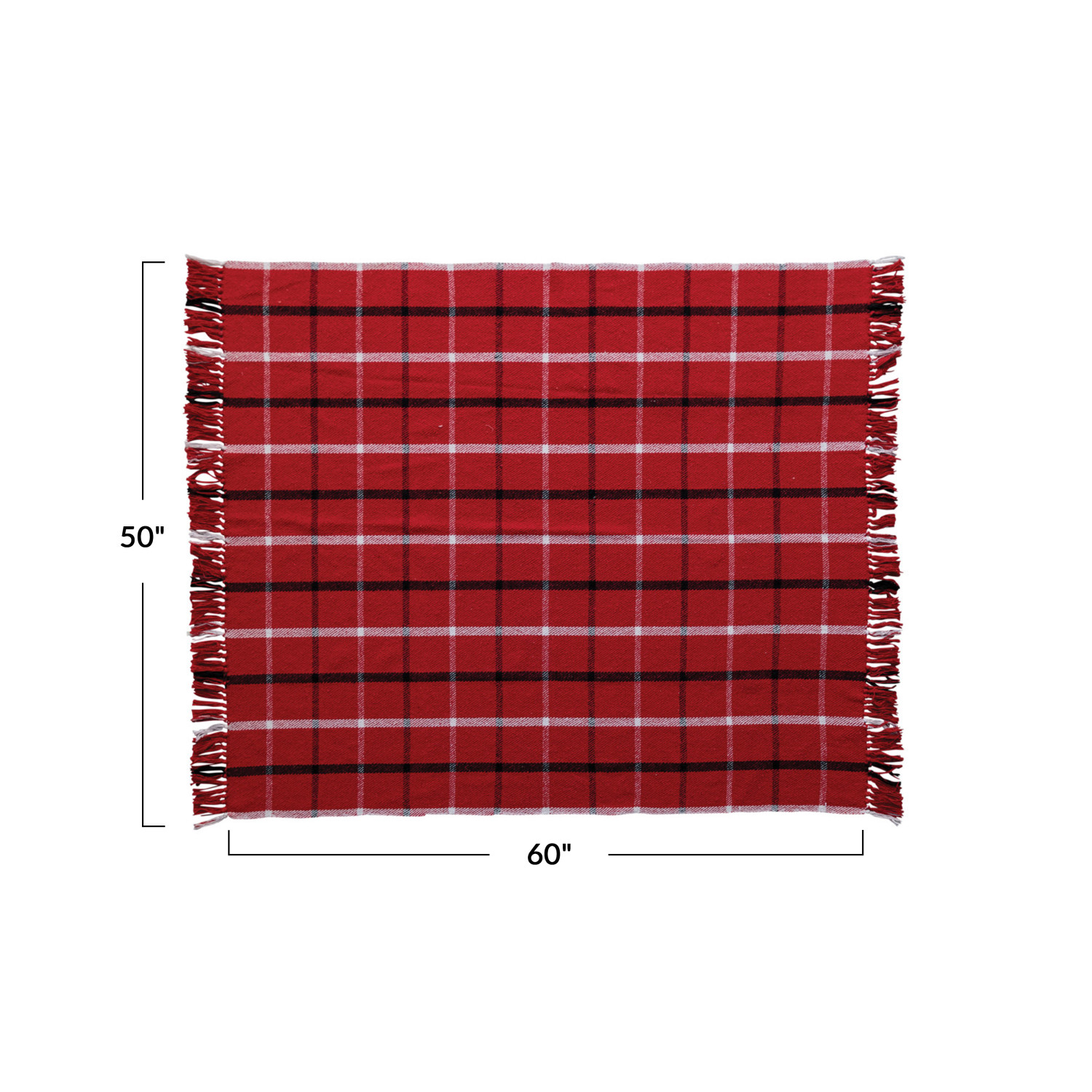 Catalog Name: 60"L x 50"W Brushed Cotton Blend Flannel Throw w/ Grid Pattern & Fringe, Red, White & Black
