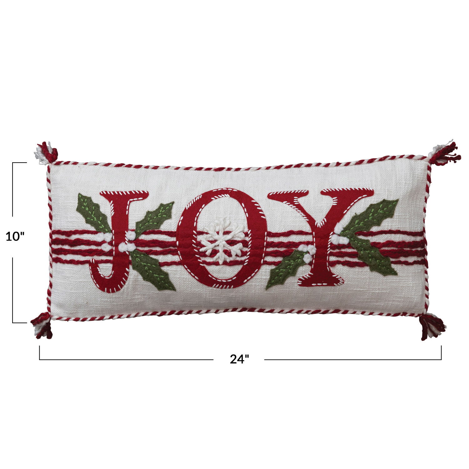 Catalog Name: 24"L x 10"H Cotton Lumbar Pillow w/ Holly, Snowflake, Embroidery, Candy Cane Piping & Tassels "Joy", Multi Color