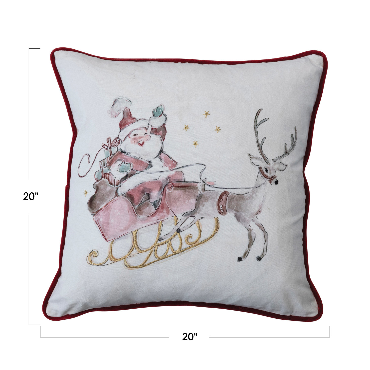 Catalog Name: 20" Square Cotton Printed Pillow w/ Santa in Sleigh, Embroidery & Burgundy Velvet Piping & Back, Multi Color ©