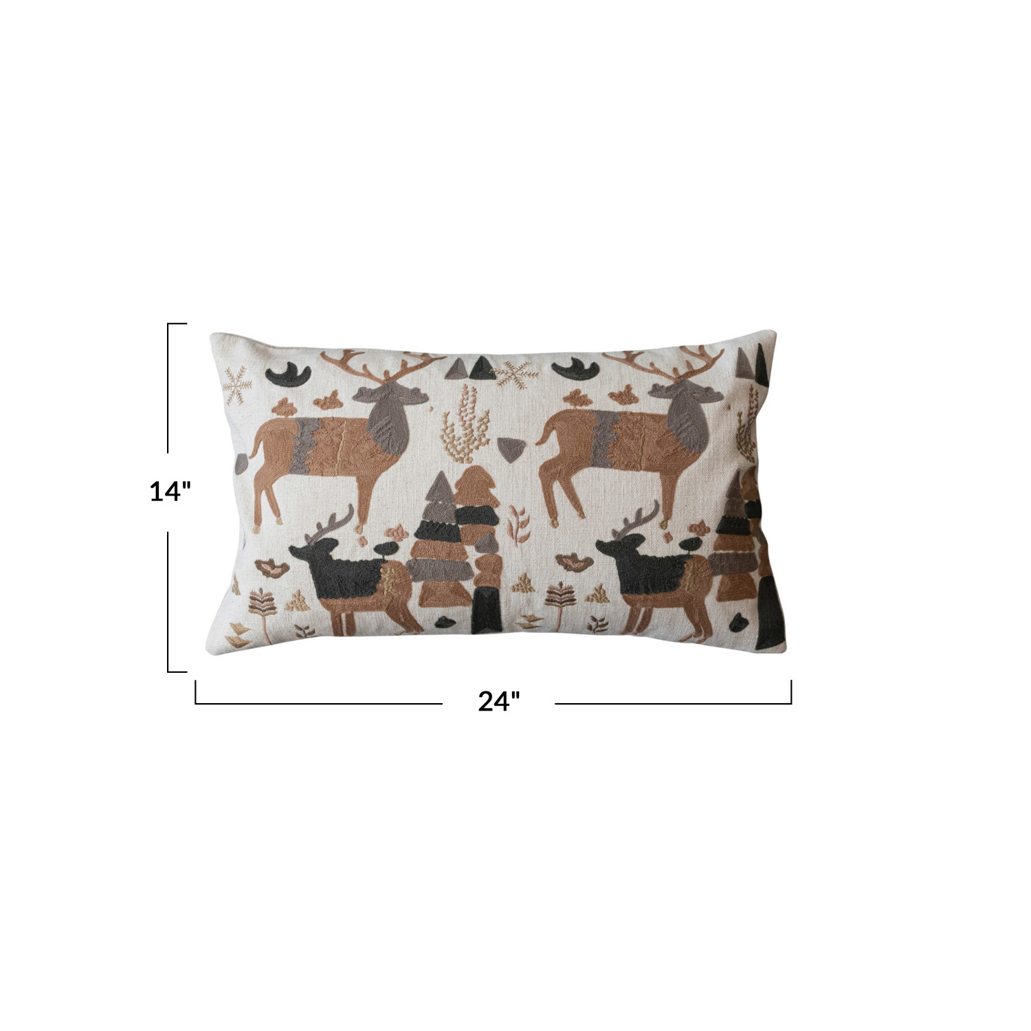Catalog Name: 24"L x 14"H Cotton & Linen Lumbar Pillow w/ Embroidered Reindeer Pattern, Multi Color
