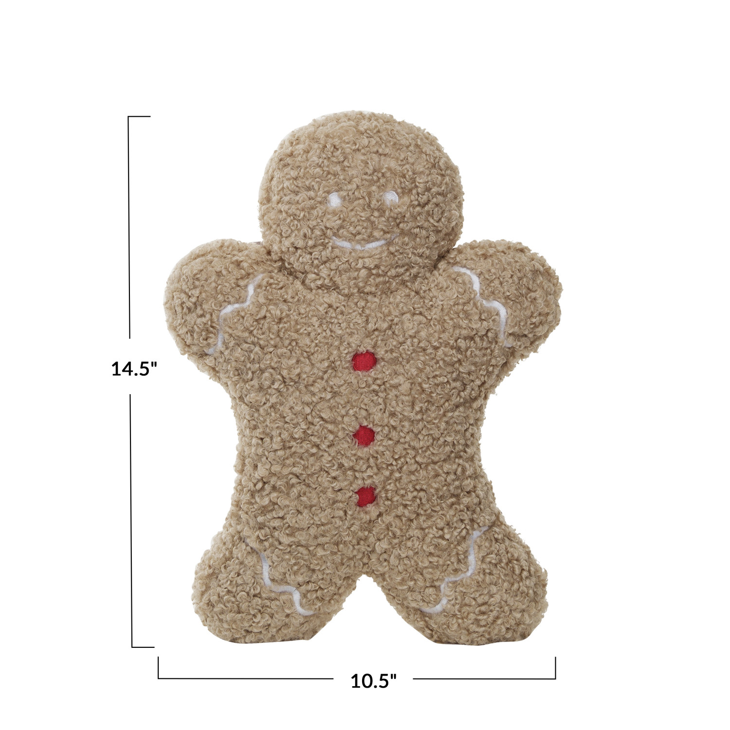 This fabric bouclé gingerbread man shaped pillow is a heartwarming piece that captures the joy of the holiday season. The combination of brown, red, and white hues brings this classic cookie character to life, while the bouclé fabric adds a touch of luxury and comfort. The polyester cover and fill ensure durability and softness, making it not just a decorative item but also a companion for those cozy winter nights. It's the perfect size to be a standout accent on a sofa or a child's bed, inviting smiles and holiday cheer. It measures 14.5 in length and 10.5 in height, making it a substantial and cuddly addition to any festive furnishings. Whether as a gift or a treat for anyone, this gingerbread man pillow is sure to add a dash of sweetness to the holiday decor. A whimsical delight, this gingerbread man shaped pillow is crafted from soft bouclé fabric in a charming palette of brown, red, and white. An adorable addition to the holiday decor, it's a playful and cozy piece that brings festive fun to any room. A plush polyester fill gives this pillow a full, firm shape.