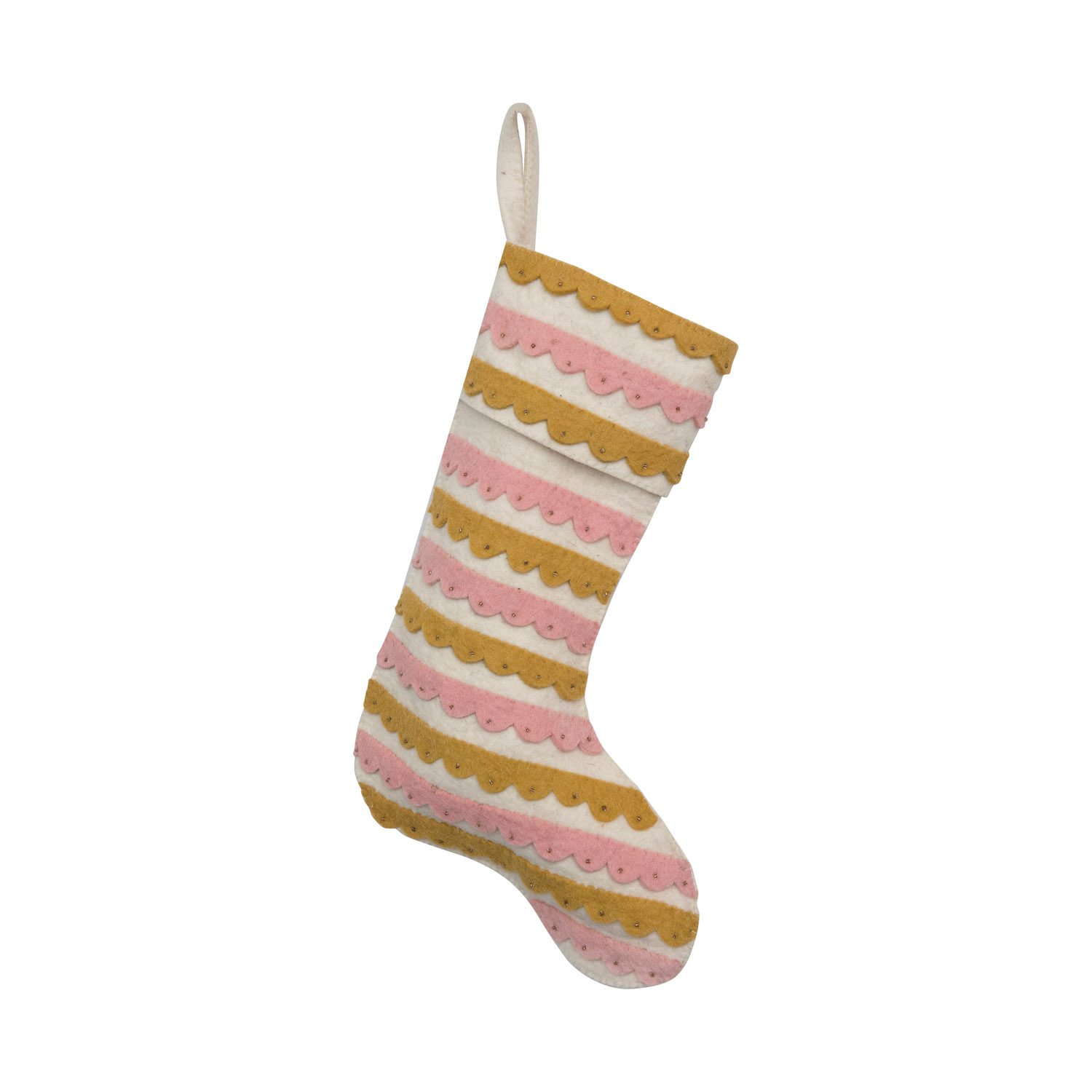 Catalog Name: 19"H Wool Felt Stocking with Appliqued Scallops and Beads, Pink, Cream and Mustard Color