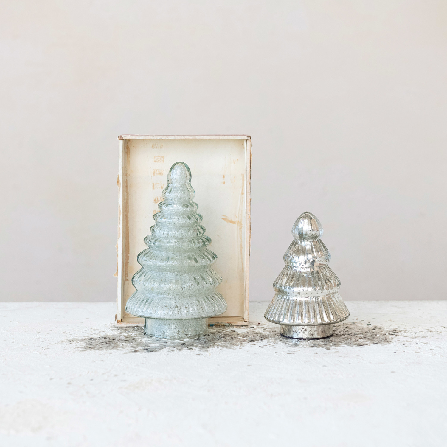 This silver-embossed mercury glass tree is a gorgeous and elegant way to decorate for the holidays. It features a mercury glass tree that has a silver finish and an embossed pattern, creating a stunning and eye-catching effect. The tree reflects light and creates a shimmering effect in any room, adding a touch of glamour and charm to the space. The tree is ideal for displaying on a table, mantel, shelf, or window sill, where it can enhance any space with its elegance and beauty. The tree is also easy to clean and store, making it a convenient and reusable option. The tree is made of mercury glass that is durable, smooth, and easy to clean, making it a long-lasting and high-quality option. It measures 4 inches in diameter and 5.5 inches in height, making it a graceful and noticeable centerpiece. Elevate the holiday decor with this eye-catching Christmas tree, adding both style and a touch of whimsy. A stunning mercury glass tree that has a silver finish and an embossed pattern. A sophisticated and festive addition to any holiday decor, this tree reflects light and creates a shimmering effect in any room. Ideal for displaying on a table, mantel, shelf, or window sill, this tree can enhance any space with its elegance and beauty.