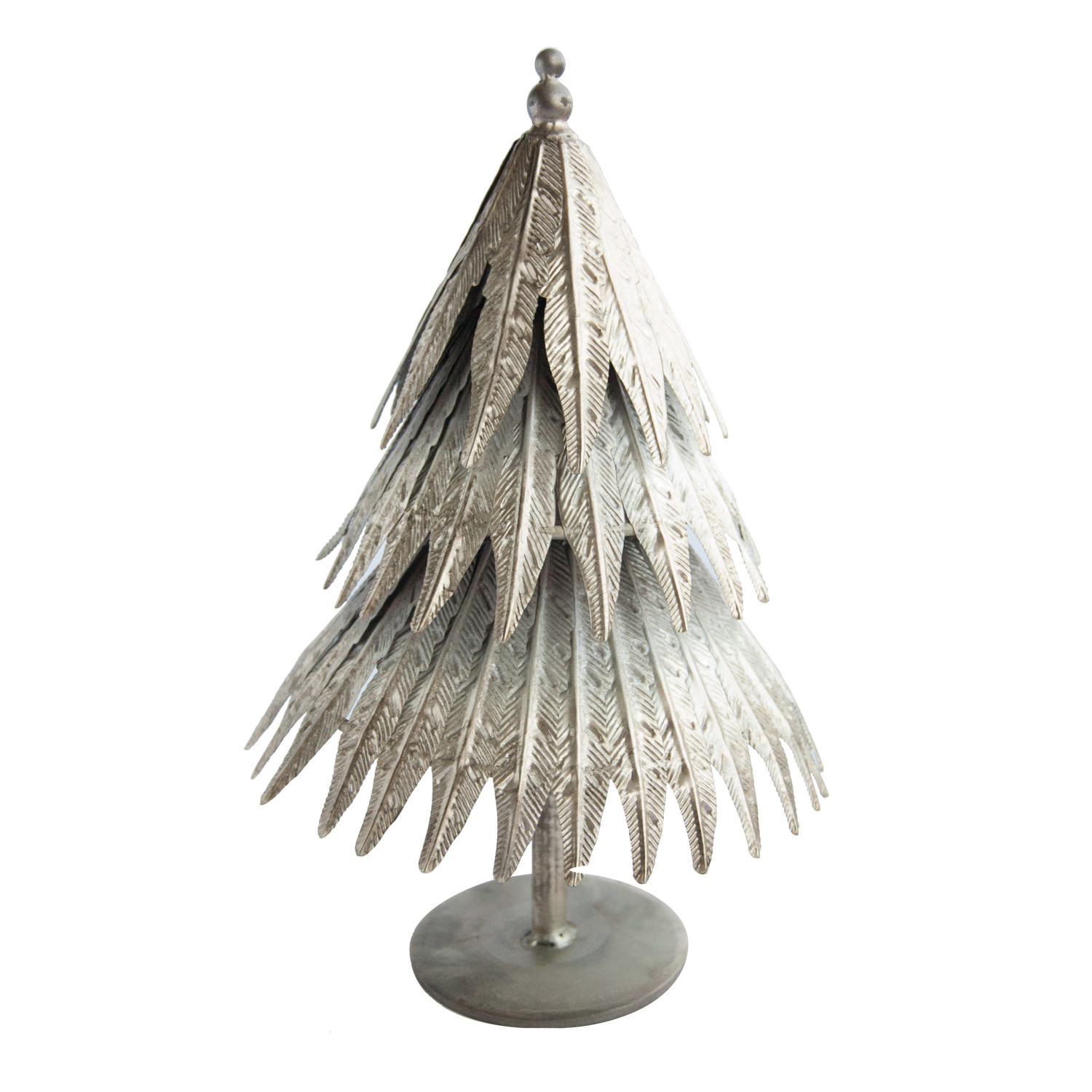 This distressed pewter embossed metal tree on stand is a lovely and unique way to decorate for the holidays. It features a round metal tree on a stand that has a distressed pewter finish and an embossed pattern, creating a cozy and rustic effect. It has a natural and elegant look that can suit any festive theme, from traditional to modern. This is ideal for displaying on a table, mantel, shelf, or window sill, where it can add a touch of warmth and charm to the space. It can also stand on its own or be paired with other trees or ornaments, making it a versatile and customizable option. It's made of metal that is durable, sturdy, and easy to clean, making it a convenient and reusable option. It measures 7.75 inches in diameter and 12.25 inches in height, making it a graceful and noticeable centerpiece. Elevate the holiday decor with this eye-catching Christmas tree, adding both style and a touch of whimsy. A round and rustic metal tree on stand that has a distressed pewter finish and an embossed pattern. A cozy and charming addition to any holiday decor, this metal tree on stand brings a touch of vintage and industrial style to any room. Ideal for displaying on a table, mantel, shelf, or window sill, this metal tree on stand can stand on its own or be paired with other trees or ornaments.