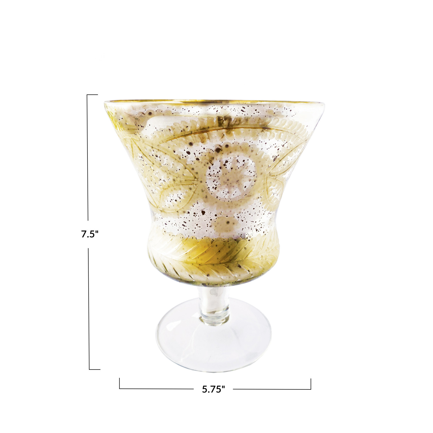 Catalog Name: 5-3/4" Round x 7-1/2"H Etched Mercury Glass Stemmed Container, Antique Silver Finish