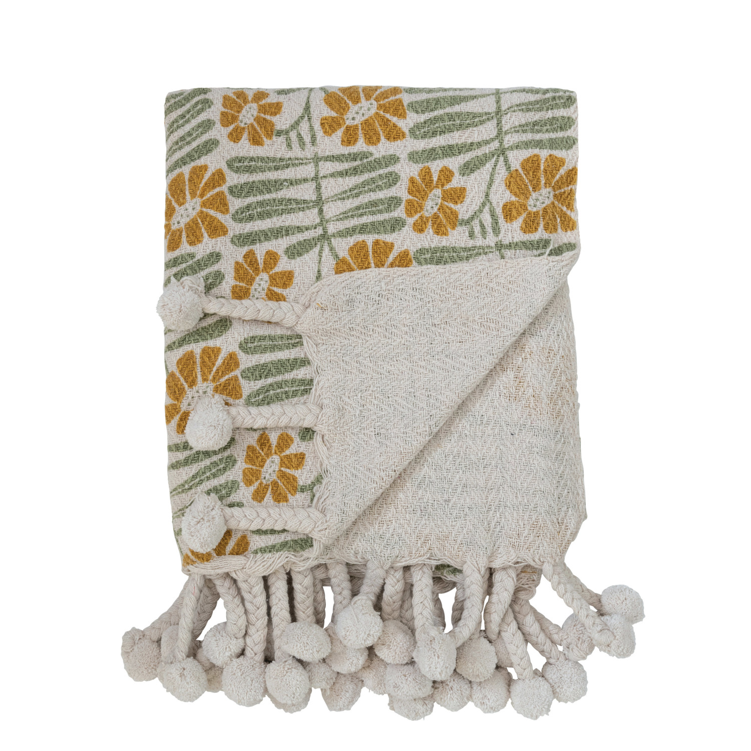 Woven Recycled Cotton Blend Printed Throw w/ Flowers & Braided Pom Pom Tassels