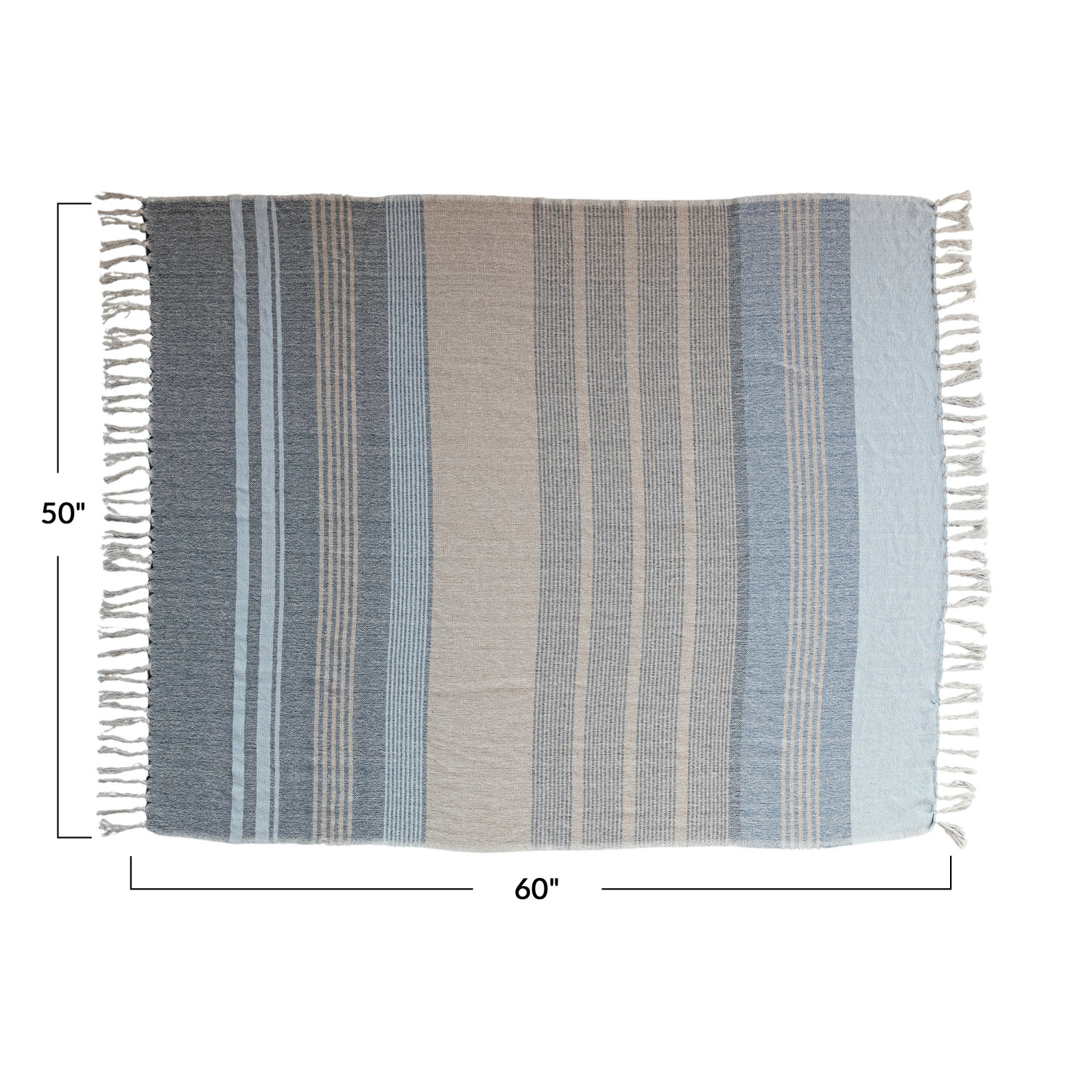 Add this Light Blue Striped Cotton Blend Throw to any home for a touch of softness and subtle color. The gentle hues are reminiscent of clear skies and calm seas, while the fringe adds a hint of whimsy. It's a piece that not only provides warmth on a cool evening but also serves as a charming decorative element in any space that cherishes the farmhouse, eclectic, or cottage vibe. It measures 60.0 inches in length and 50.0 inches in width, with a light and airy presence that invites relaxation. Durable, comfortable, and stylish, it's an essential for any cozy retreat.