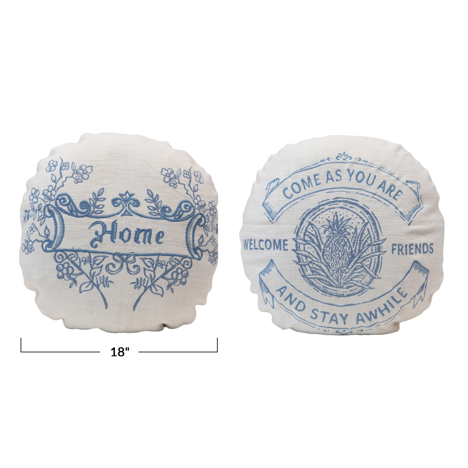 Catalog Name: 18" Round Linen Blend Embroidered Pillow w/ Saying, Cream Color & Blue, 2 Styles ©