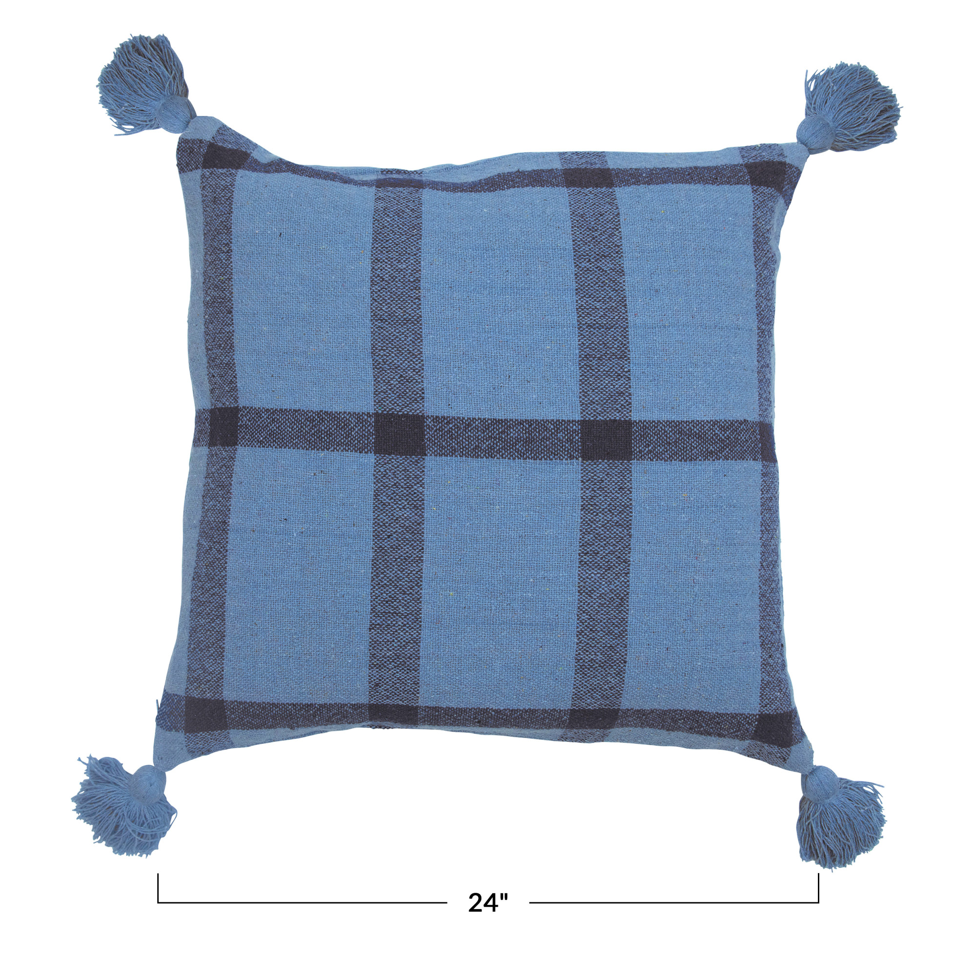 Blue woven recycled cotton blend pillow with grid pattern and tassels; 52% Cotton, 32% Polyester, 10% Acrylic, 6% Rayon, Filling: 100% Polyester; 24"L x 24"W x 2"H. Prop 65 Compliant. Machine Wash Cold With Mesh Bag.