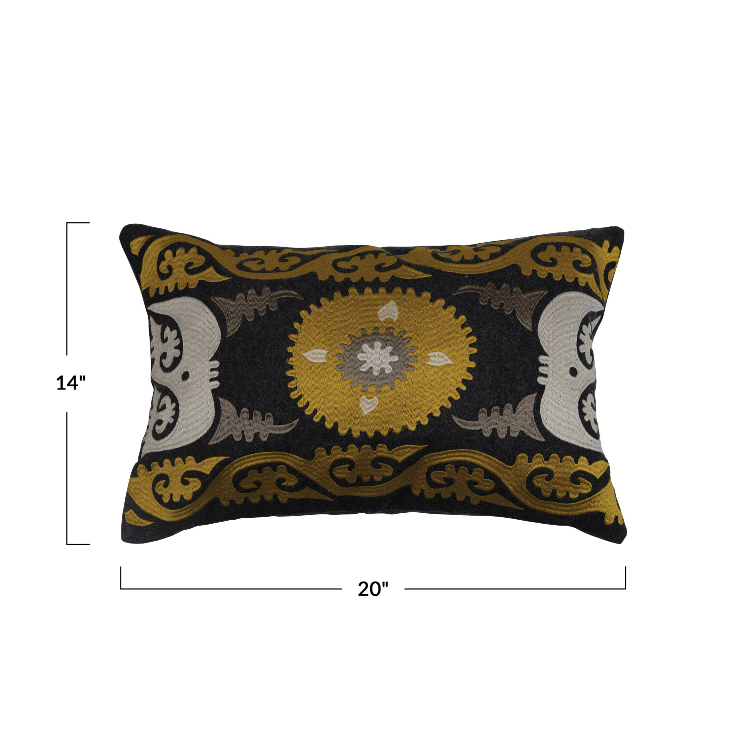 Multicolor wool blend embroidered lumbar pillow; 41% Wool, 38% Polyester, 18% Acrylic, 3% Other Fiber; 20"L x 14"W x 2"H. Prop 65 Compliant. Spot Clean Only.