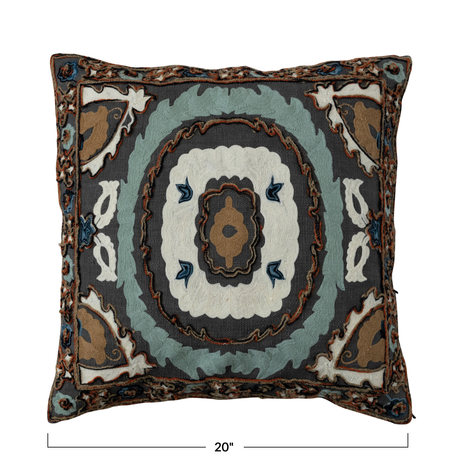 This multicolor cotton slub embroidered pillow with a chambray back is the perfect way to add a touch of colorful charm to the home. The soft yet durable fabric is ideal for everyday use, and the intricate embroidery adds a unique touch. The pillow features a back opening for easy insert removal and is machine-washable for easy care. It is also perfect for any room in the home, from the living room to the bedroom. Use it as a throw pillow on the couch, bed, or floor pillow to create a cozy seating area. It is also an excellent gift for any occasion. The cushion measures 20 inches long and 20 inches high. Whether used as a lumbar support on the couch or as a decorative accent on the bed, this quality pillow will make the home more beautiful and cozy. A colorful and cozy square pillow with a cotton slub cover, featuring a multi color embroidered design on the front and a chambray fabric on the back. With back opening; add some bohemian to eclectic feel to the sofa, bed, or chair. Polyester fill insert included. The pillow cover is made from cotton; the insert is made from polyester.