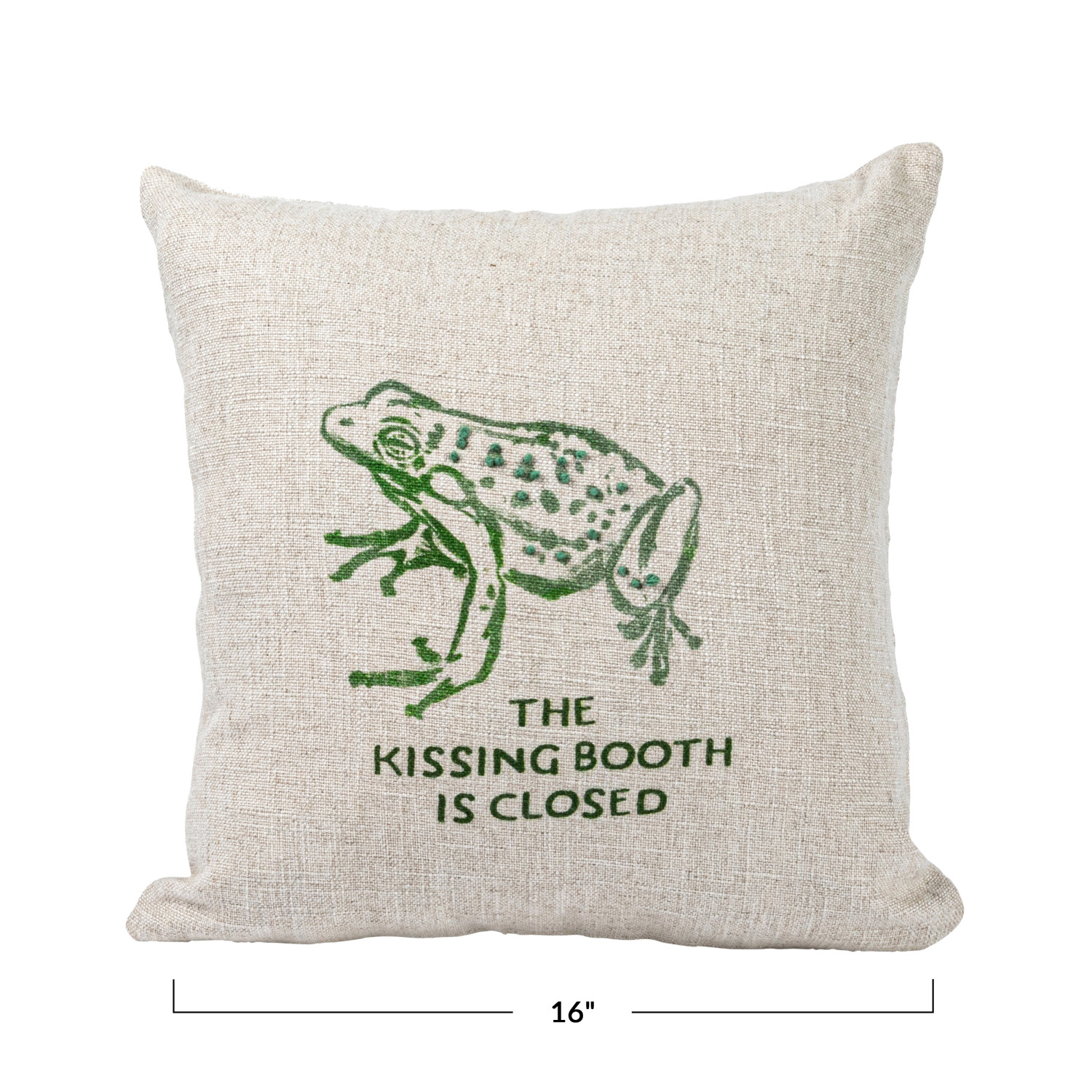 Add a whimsical touch to every home decor with the 16-inch Square Linen Blend Printed Pillow featuring an adorable frog and the playful text "The Kissing Booth is Closed", with Intricate French knots that add dimension and charm to the design. The pillow's linen blend fabric provides a soft and durable texture, while the natural and green color palette complements a variety of interior styles, and can be put on the couch, bed, or favorite chair for a delightful accent. This pillow features a rayon-linen blend cover that is comfortable and durable, and a 16-inch square shape that is versatile. This product is made of rayon and linen blend. This pillow measures 16 inches in length and 16 inches in width. Add a whimsical touch to every home decor with the 16-inch Square Linen Blend Printed Pillow featuring an adorable frog and the playful text "The Kissing Booth is Closed", with Intricate French knots that add dimension and charm to the design. The pillow's linen blend fabric provides a soft and durable texture, while the natural and green color palette complements a variety of interior styles, and can be put on the couch, bed, or favorite chair for a delightful accent. This pillow features a rayon-linen blend cover that is comfortable and durable, and a 16-inch square shape that is versatile. This product is made of rayon and linen blend.