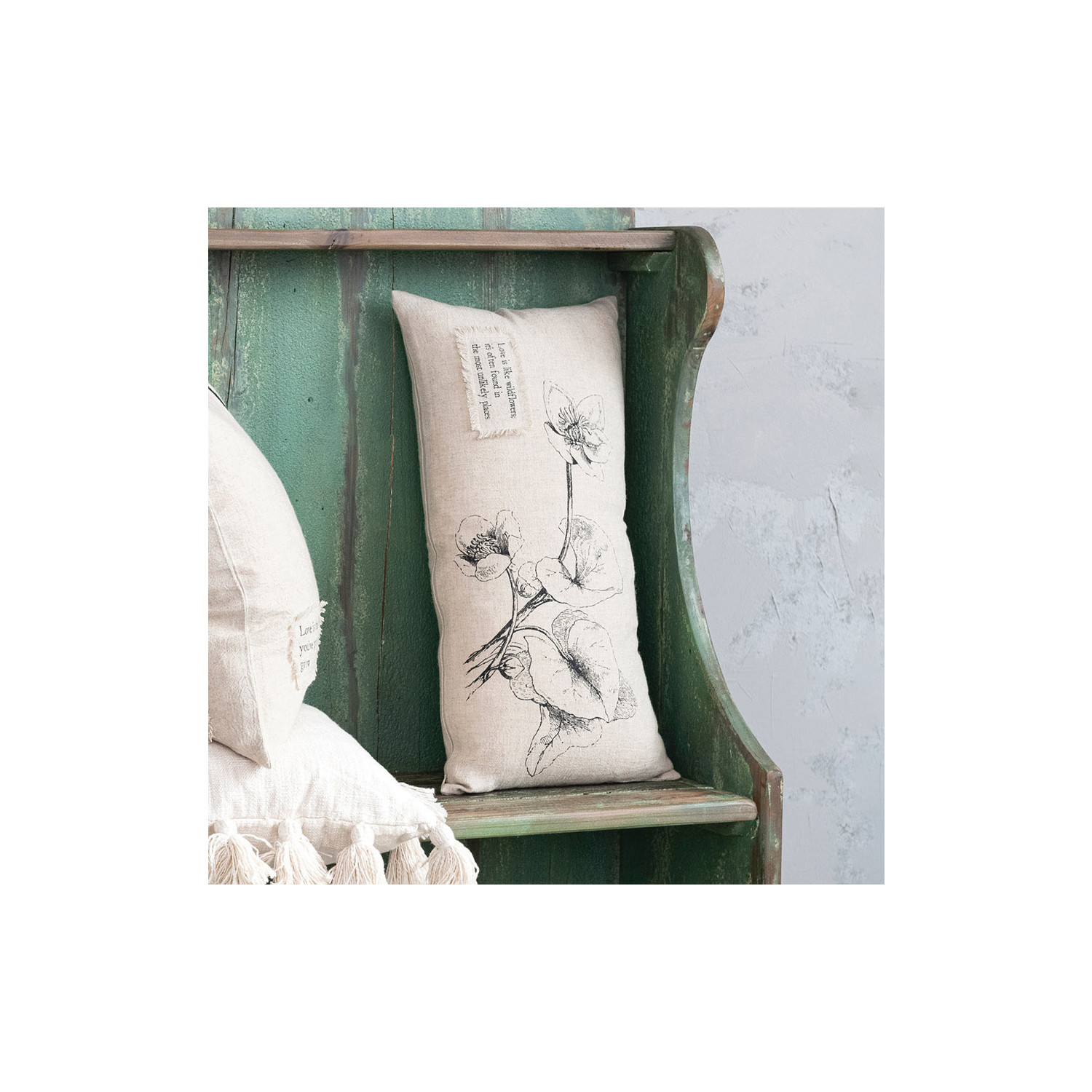 The Linen Blend Printed Lumbar Pillow has a natural and black color palette, combined with the charming saying text, flowers, and bird designs, adding a touch of elegance and whimsy to any space. The neutral color scheme allows for easy integration with existing decor, while the intricate designs add a unique and artistic flair. Crafted from a high-quality linen blend fabric, this pillow offers a luxurious feel and durability, the printed design on the front and the decorative flowers and bird on the back create a visually captivating and versatile piece. The product is made of cotton. This pillow measures 24 inches in length and 12 inches in width. The Linen Blend Printed Lumbar Pillow has a natural and black color palette, combined with the charming saying text, flowers, and bird designs, adding a touch of elegance and whimsy to any space. The neutral color scheme allows for easy integration with existing decor, while the intricate designs add a unique and artistic flair. Crafted from a high-quality linen blend fabric, this pillow offers a luxurious feel and durability, the printed design on the front and the decorative flowers and bird on the back create a visually captivating and versatile piece. The product is made of cotton.