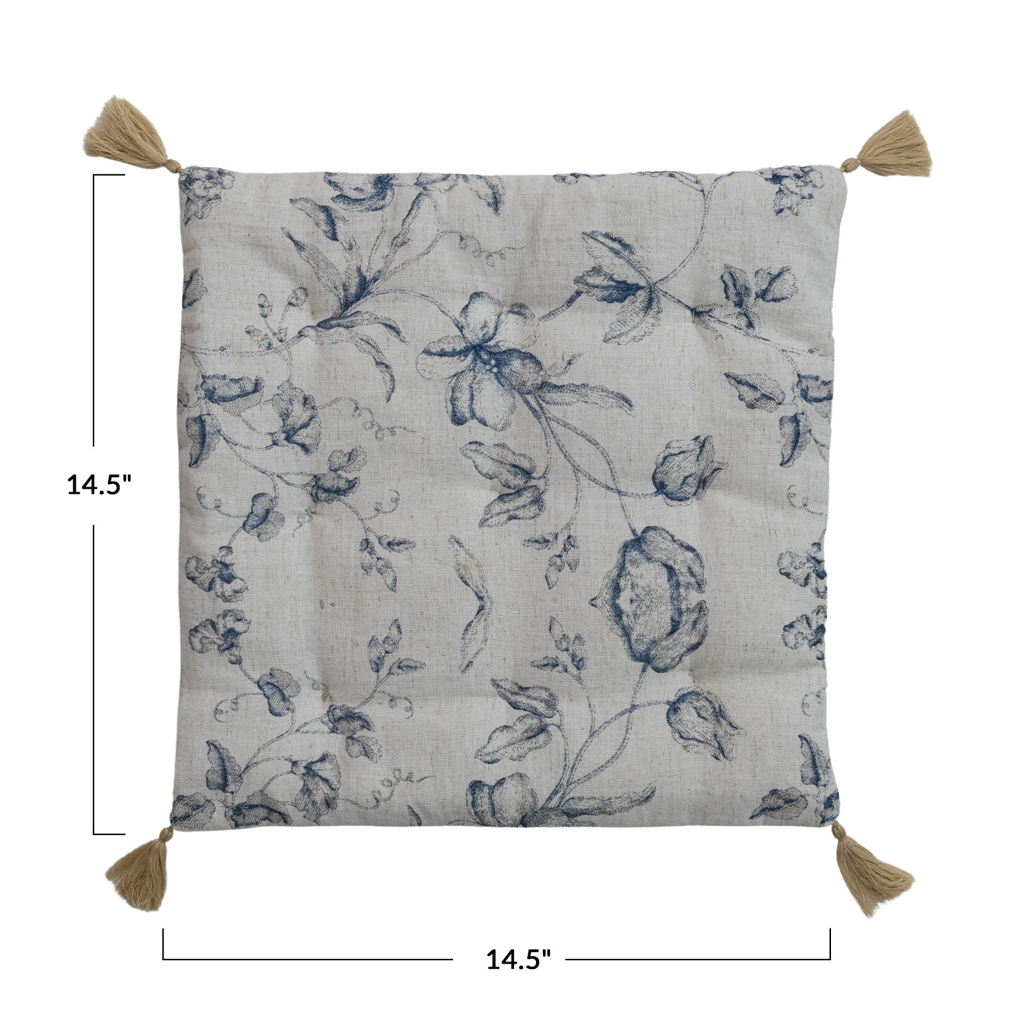 Catalog Name: 14-1/2" Square Cotton & Linen Printed Chair Cushion w/ Floral Pattern, Hand-Embroidered Kantha Stitch, Tassels & Chambray Back, Natural & Blue (Each One Will Vary)
