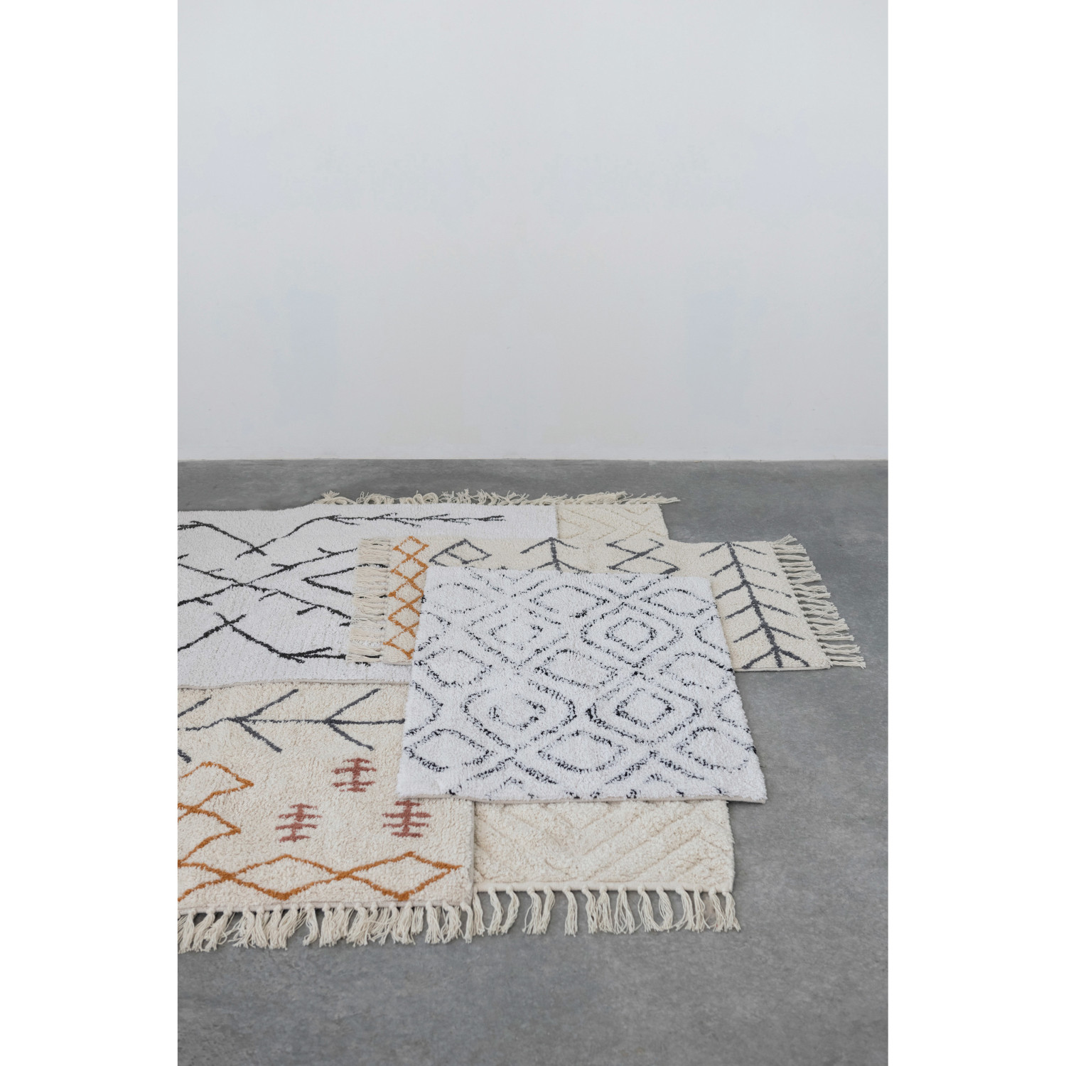 This modern boho rug showcases a geometric print on soft tufted cotton. Black and white tufted cotton geometric print rug. Spot Clean Only. 97% Cotton, 3% Other Fibers.