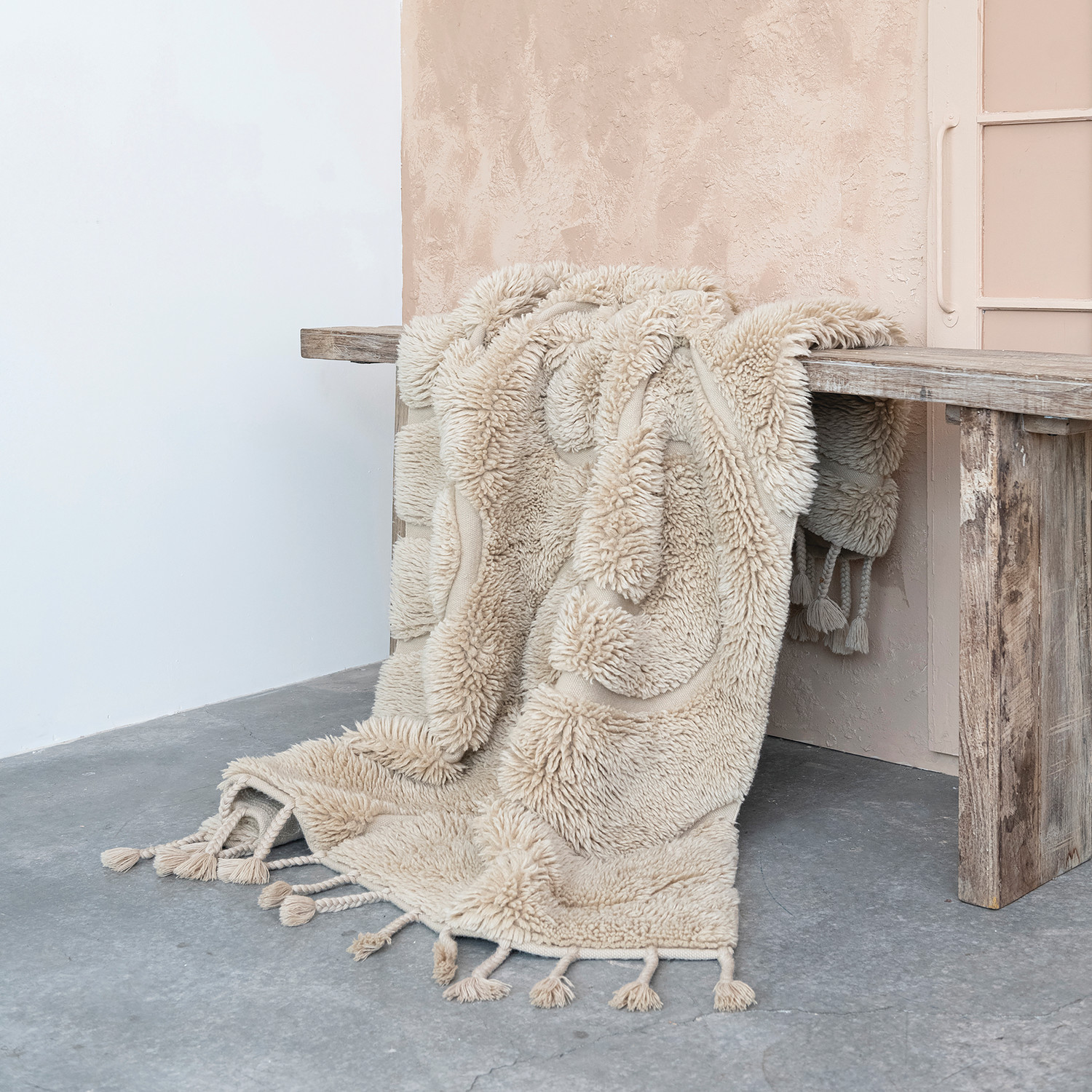Enhance the home with this lovely rug that features a tufted design and tassels in tan color. The rug is made of high-quality New Zealand wool and cotton, which are natural and eco-friendly materials that offer durability and comfort. The wool provides warmth and softness, while the cotton adds strength and breathability. The tufted design creates a textured and plush feel, while the tassels add a playful and bohemian touch. The tan color is neutral and easy to match with any color scheme. Place it in the living room, bedroom, dining room, or entryway, this rug will reflect light and create a cozy feel. The rug is easy to care for, vacuum it regularly and spot clean it with mild detergent and water. For stains, professional cleaning is recommended. This rug is a beautiful piece of art that will enhance the home with its beauty and functionality.