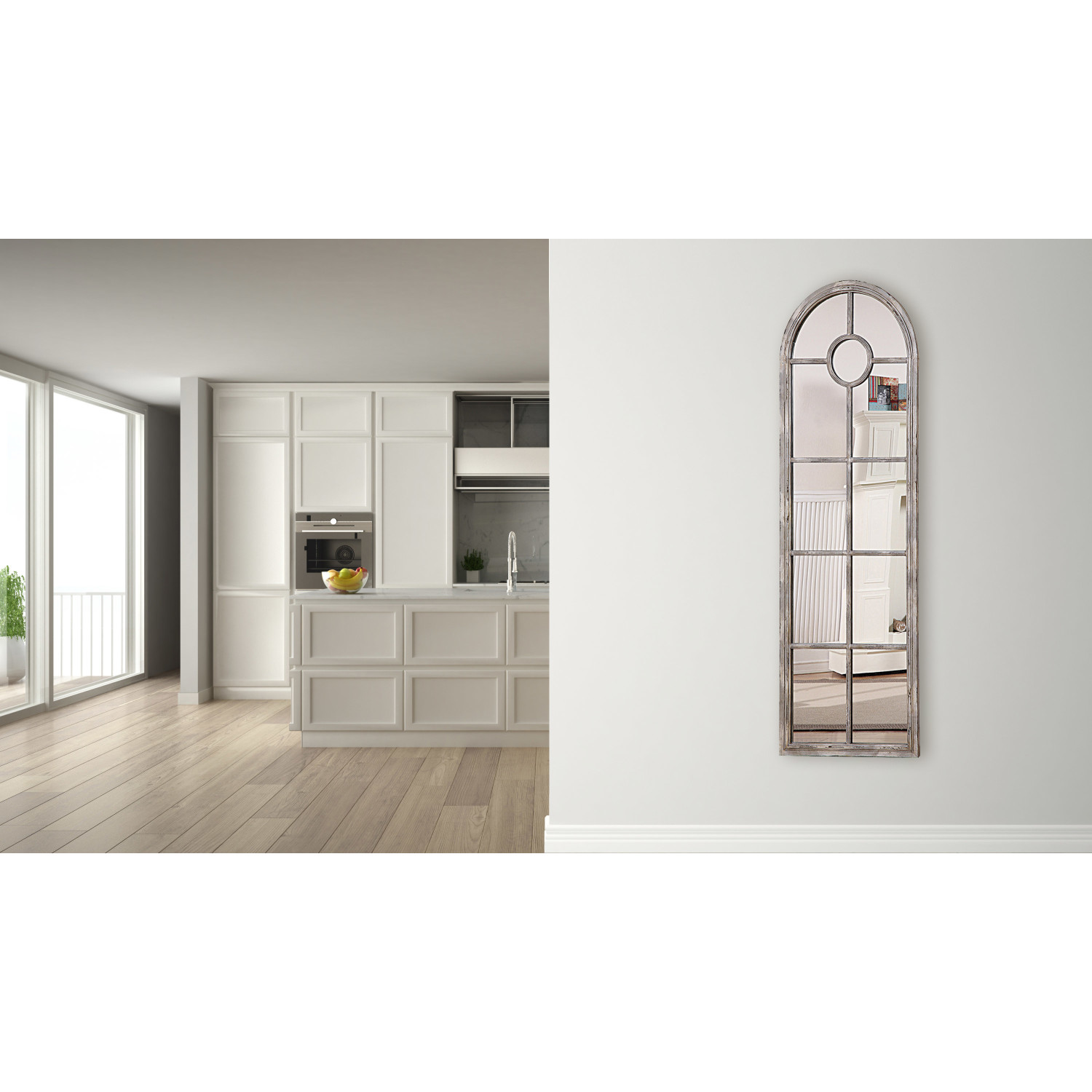 Bring light and depth into your home by adding this tall mirror with arched top. The mirror's metal frame has a distressed white finish giving it a cozy cottage appearance. Perfect for an entryway or hallway, this mirror is perfect for nearly any home.