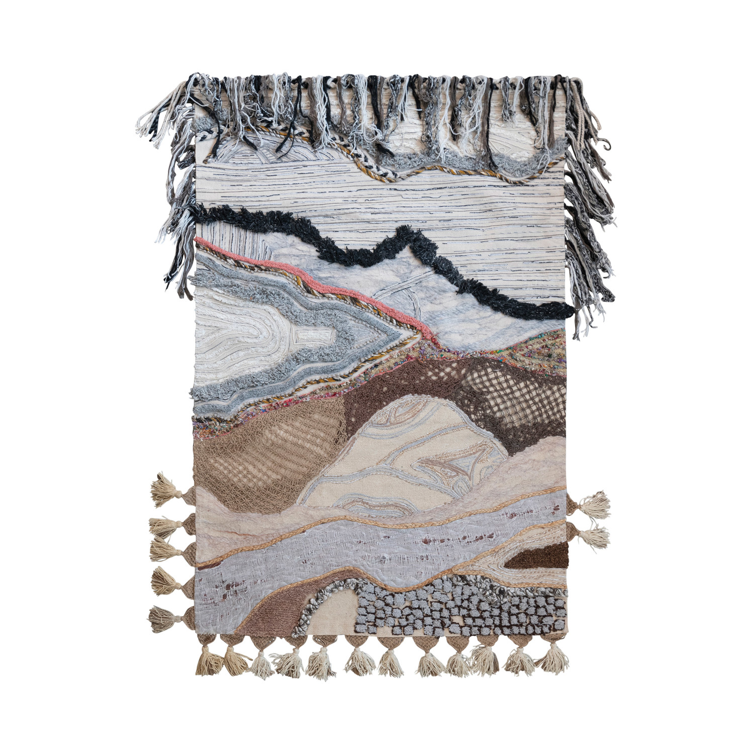 Catalog Name: 48"W x 72"H Hand-Woven Cotton Blend Wall Hanging w/ Wood Hanger, Varying Pile Height, Embroidery, Fringe & Tassels, Multi Color