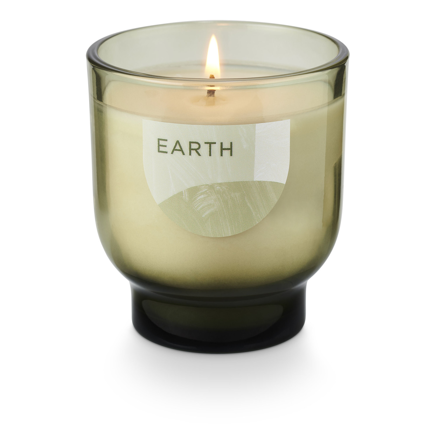 A footed glass candle in translucent color dances with beautiful earth tones when lit.