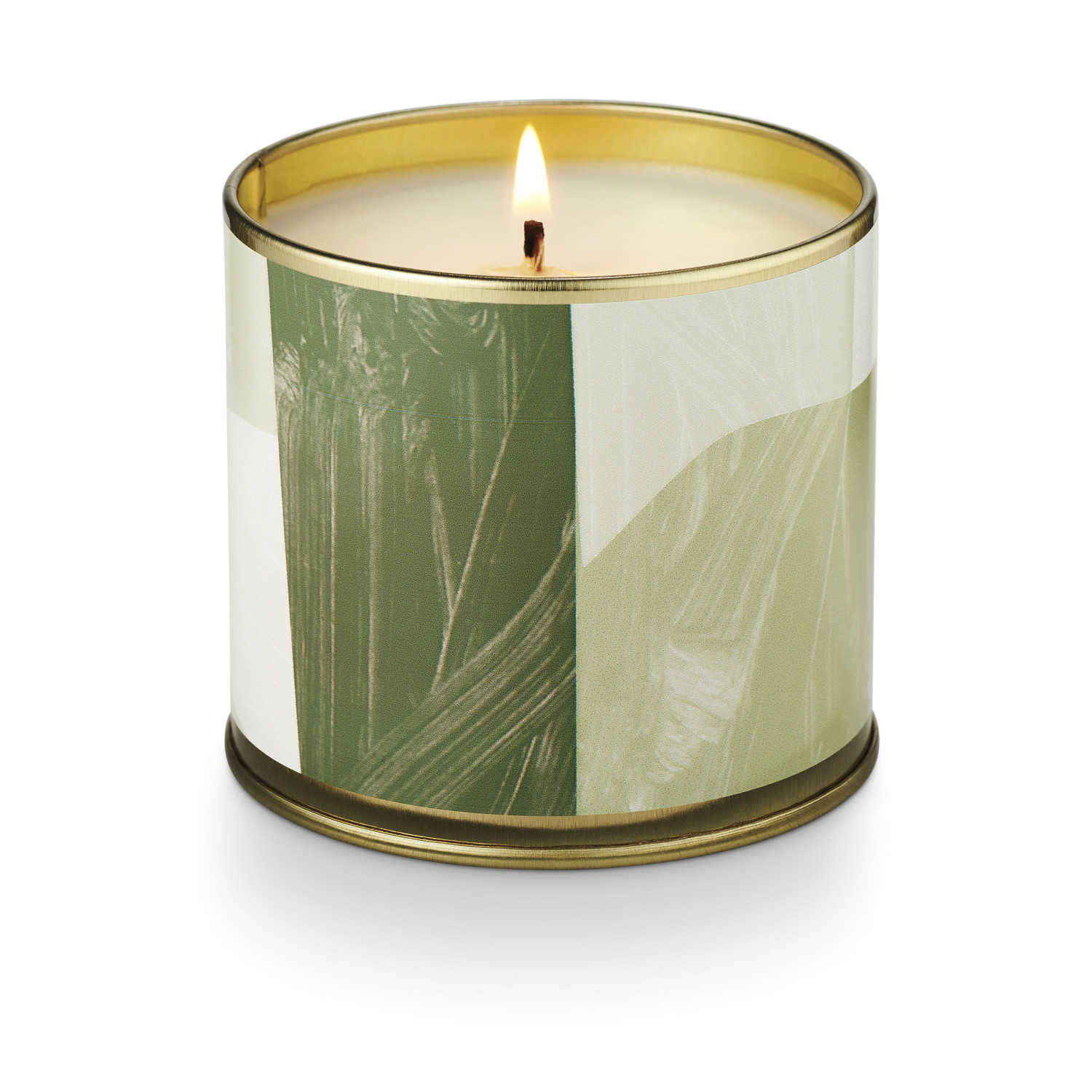 A painterly tin candle with organic shapes and movement, lidded in matte gold.