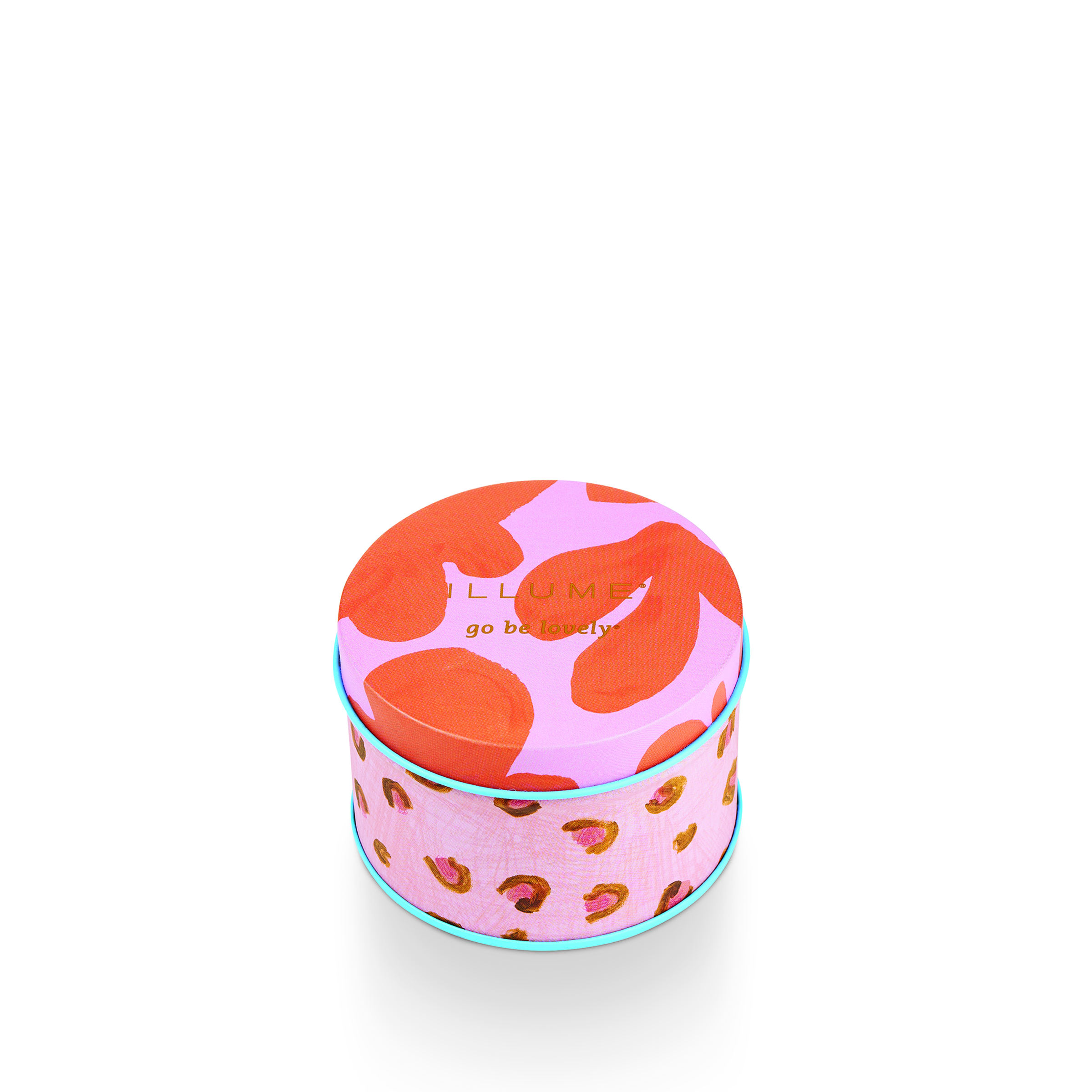Fragrance Description: A blissed out romance of tropical fruit, pink pepper, and vivacious rose. Burn Time: 20 Hours. 4.2 oz. Lidded Tin Candle. Go Be Lovely Collection.
